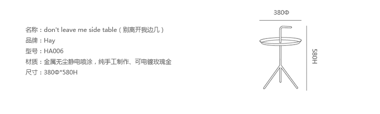 Don't Leave Me Side Table(别离开我边几)出自丹麦安博anbo(中国)Thomas Bentzen之手,Don't Leave Me Side Table(别离开我边几)以粉体涂装钢材制成,不仅有着可爱俏皮的外型,顶端的弯曲部份可以轻松的提起它,是一张非常实用的活动边几,同时也可以户外使用。
