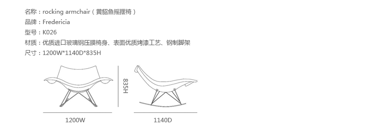 Rocking Armchair(黄貂鱼摇摆椅)由Thomas Pedersen于2002年设计的一款现代经典的摇椅。简洁大方的造型可以提供各种坐姿。Thomas Pedersen的创意让人惊喜,设计灵感来源于自然界中有机形状以及鱼缸液体流动动态。木质椅面上尚可见细腻的纹理,素淡的颜色不会再设计上喧宾夺主。椅子金属底座的弧度,赋予了活动的幅度,让人不觉束缚。美观与舒适兼具,难怪被Fredericia Furniture强力推出。