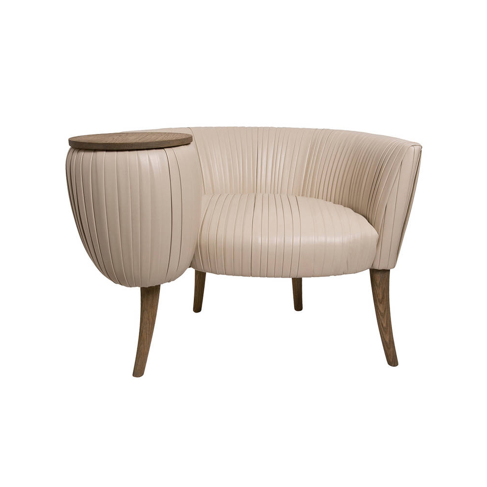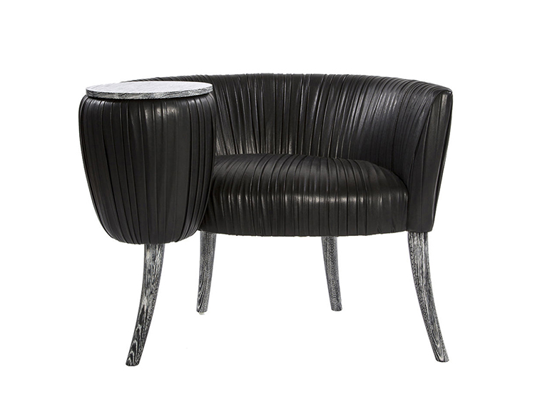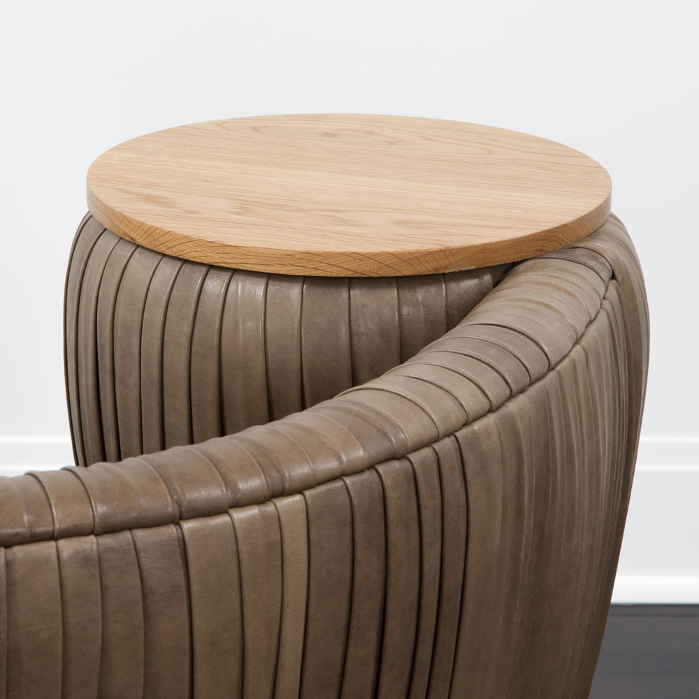 这款椅子的精致线条采用标志性皱折皮革细节设计。 这款精美细腻的椅子有一个小的附着的桌面和锥形腿,全部由手工橡木制成。