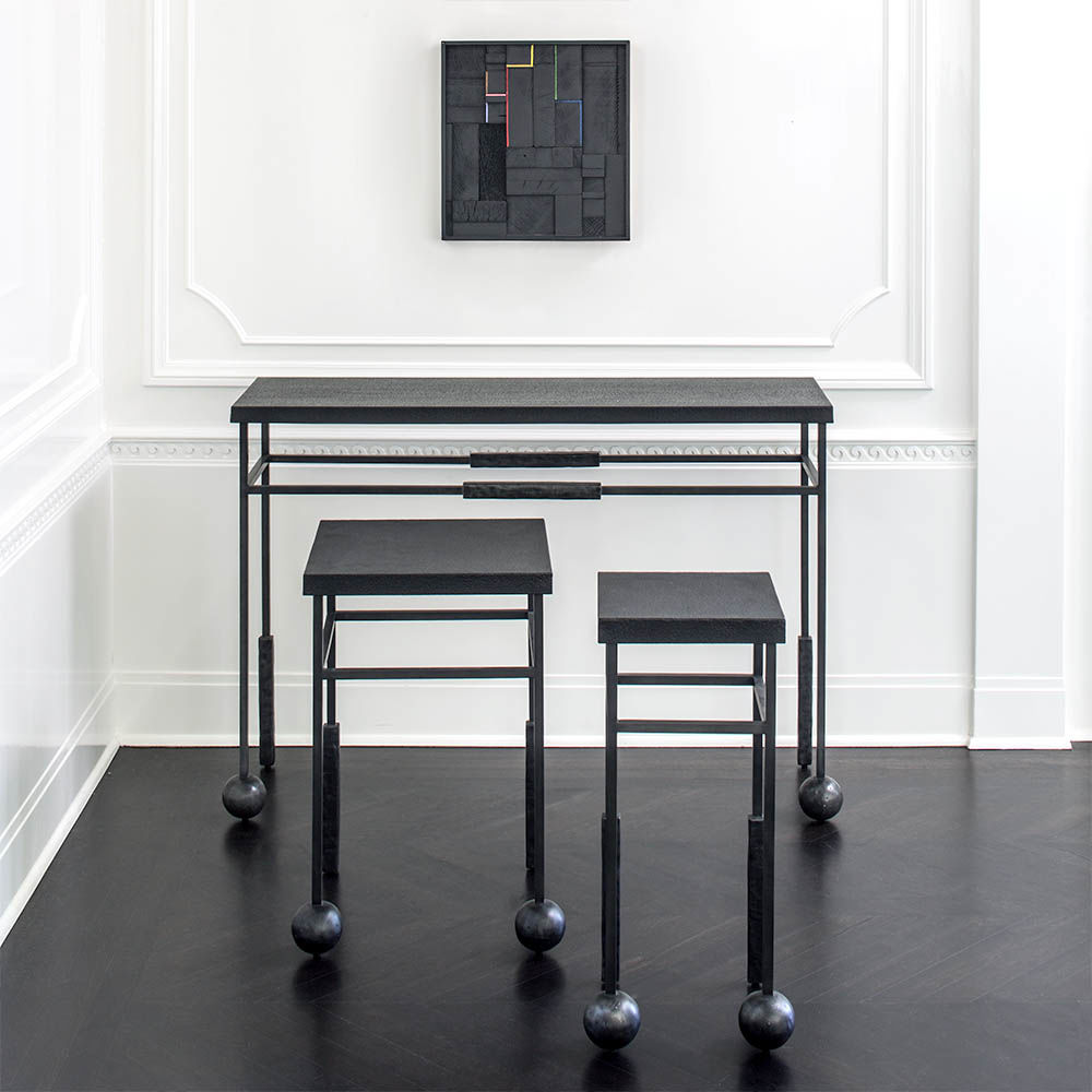 雕刻的尼姆饮料桌是由黑色不锈钢手工制作而成,具有细长,光滑的铸造方形细高跟腿,手工雕刻的铸钢球体和黑色花岗岩顶部。