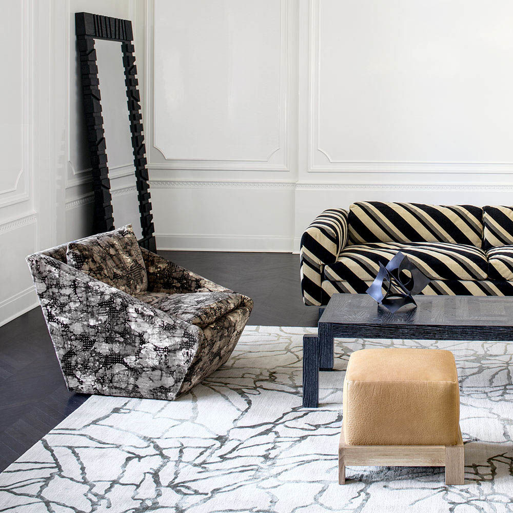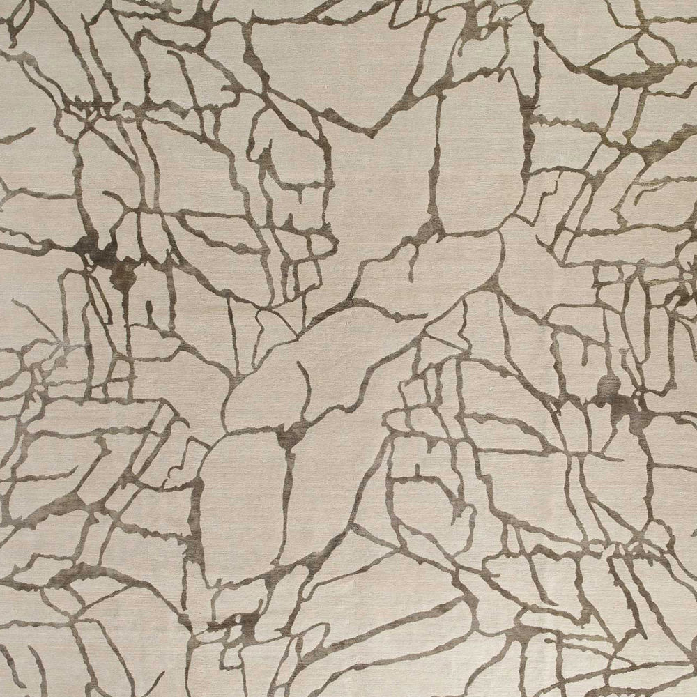 从石头和大理石的天然纹理中汲取灵感,当光线照射到丝线上时,Tracery地毯有机线条的变化和闪烁。 背景是西藏羊毛,呈暖灰色,图案为柔软的橄榄绿色丝绸。