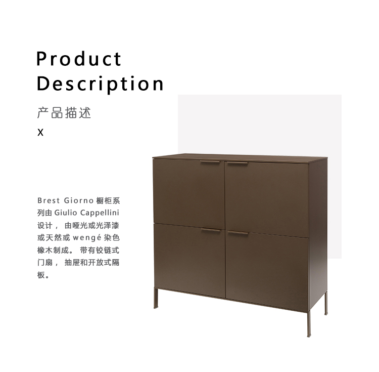 Brest Giorno橱柜系列由Giulio Cappellini设计,由哑光或光泽漆或天然或wengé染色橡木制成。 带有铰链式门扇,抽屉和开放式隔板。