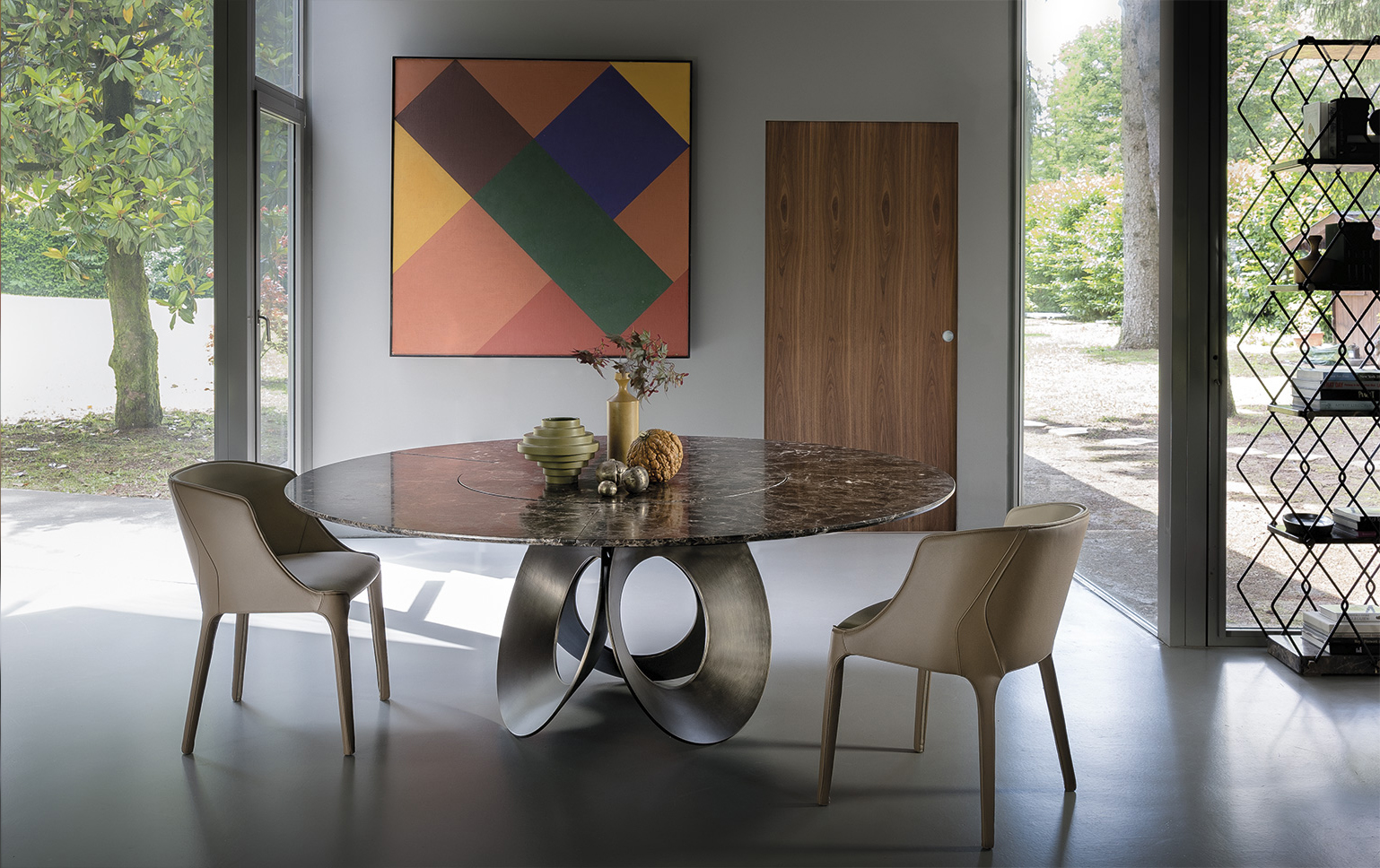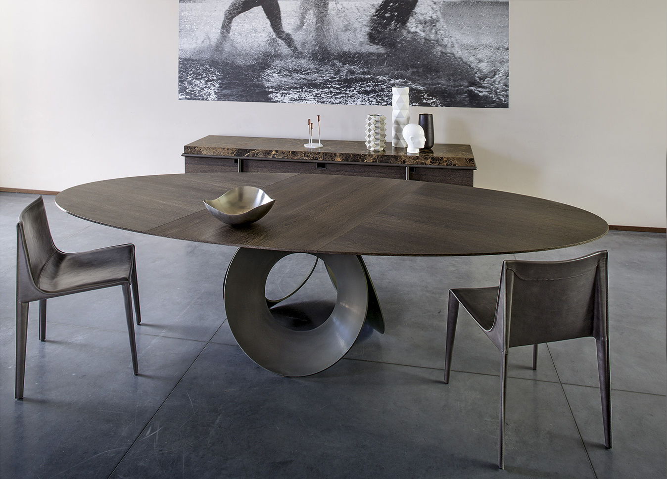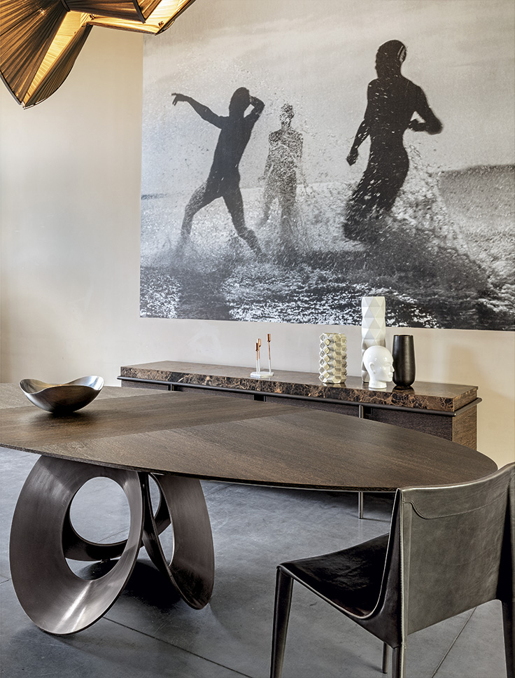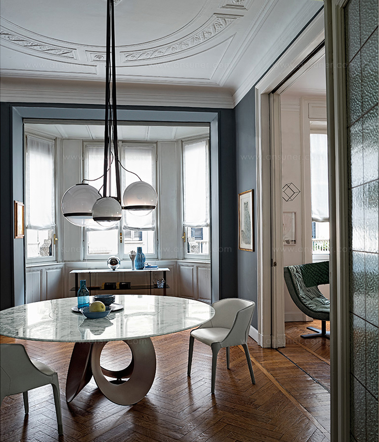 由吉诺·卡罗罗(Gino Carollo)设计的Oracle餐桌是圆形的几何形状,是完美的象征。安博网页版的形状表现出整体性和中心性。圆形或椭圆形的桌面是由MDF镶嵌在莫卡橡木或柚檀木上。直径为200CM的桌面也可以使用啡网纹大理石桌面。它独特的底座就像生命之花的构造:三个重叠的圆圈,似乎围绕着一个点旋转。该金属的底座可用云母棕色、黄铜、钛或新草灰色抛光。