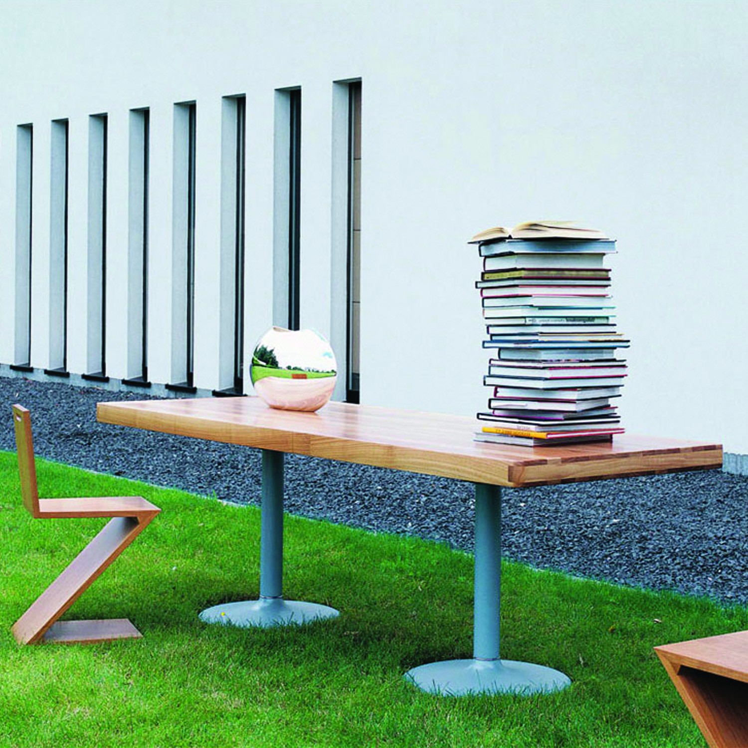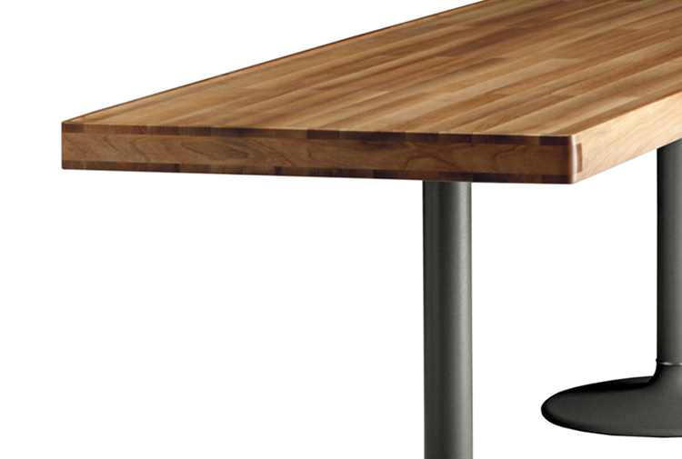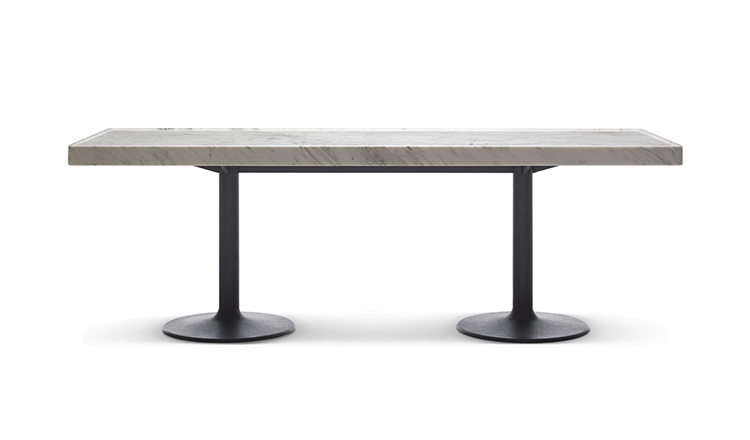 1984年的Charlotte Perriand设计的LC11复版。花冠脚桌。灰色搪瓷钢架机构和铸铁基底。一种采用哑光清漆胡桃木桌面(长220 cm - 86.6"),另一种采用卡拉拉大理岩桌面和灰色铸铁桌腿(长213,5 cm - 84")。包括二种基本型式的餐桌,第一种于1934年为Le Corbusier的Rue de Nungesser et Coli区巴黎公寓创作,第二种于1935年份为布鲁塞尔Maison du Jeune Home设计。