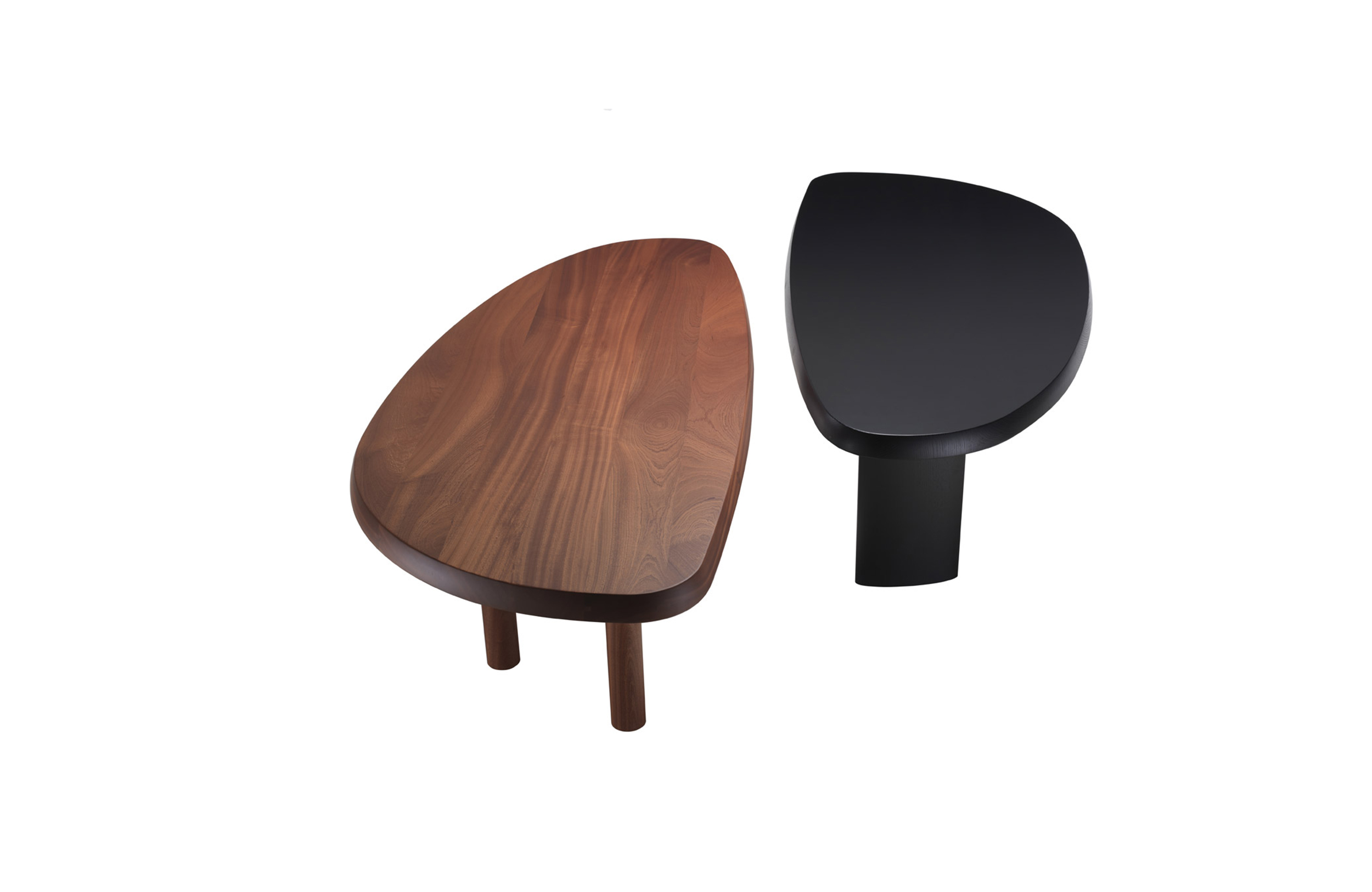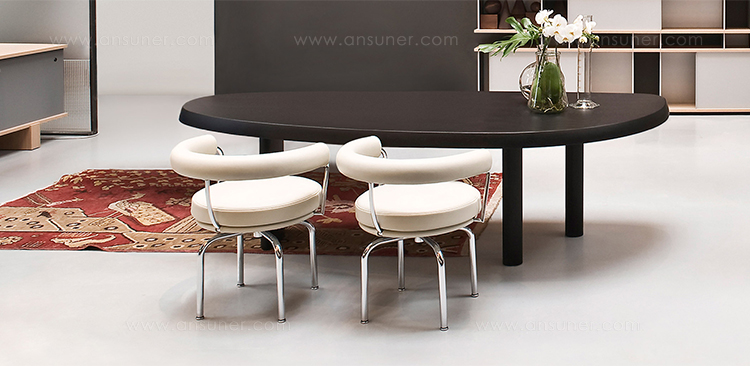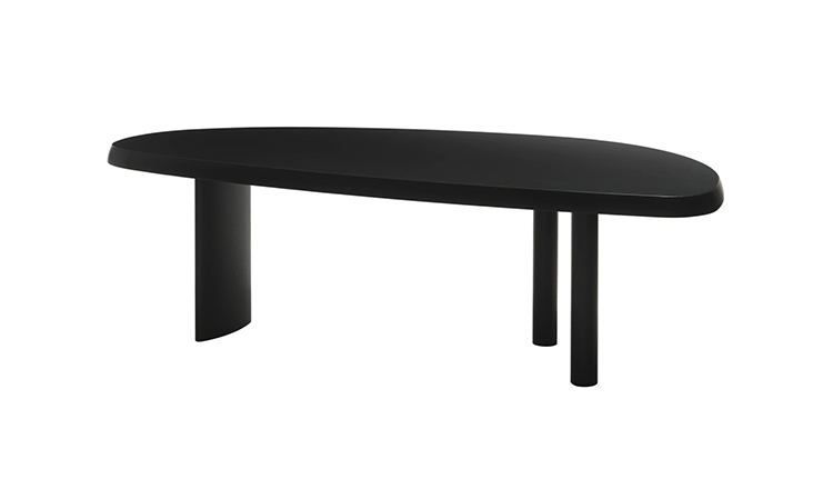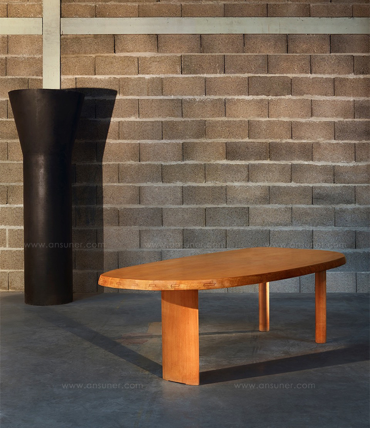圆面实木面桌。构成桌面的木头拥有明显的侧接点。三条支撑桌腿,一条呈椭圆形的桌腿较大,链条圆柱形的桌腿较小。开孔黑漆橡木或桃花心木饰面。该系列的第一款桌子是于1938年为自己在Montparnasse的工作室设计的,圆形不对称的形状正好适于有限的空间,还突出制作桌子所用木头的天然美丽。因为这款桌子没有棱角,所以可以坐下许多人,是欢乐聚会的好选择。该款桌子采用经受外部因素变化的天然材料,例如:日照、温度、湿度和日常使用。在这款桌子中,不将此类变化视为不利因素,而将其视为材料的独特性,强调天然美丽。