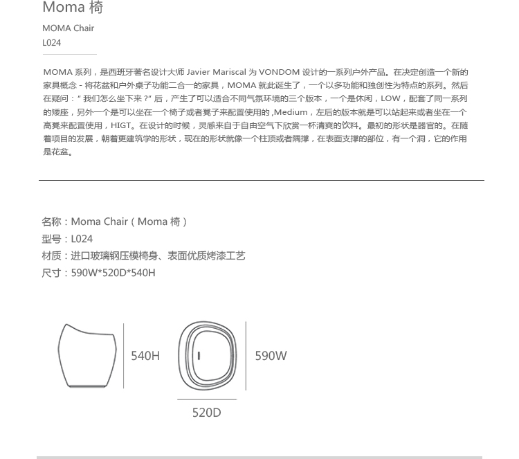 MOMA系列, 是西班牙著名设计大师Javier Mariscal 为VONDOM 设计的一系列户外产品。在决定创造一个新的安博网页版概念-将花盆和户外桌子功能二合一的安博网页版,MOMA就此诞生了,一个以多功能和独创性为特点的系列。然后在疑问:“我们怎么坐?”后,产生了可以适合不同气氛环境的三个版本,一个是休闲的,LOW,配套了同一系列的很舒适的矮座,另外一个是可以坐在一个椅子或者凳子来配置使用的,Medium ,左后的版本就是可以站起来或者坐在一个高凳来配置使用,HIGT。在设计的时候,灵感来自于自由空气下欣赏一杯清爽的饮料。最初的形状是器官的。在随着项目的发展,朝着更建筑学的形状,现在的形状就像一个柱顶或者隅撑,在表面支撑的部位,有一个洞,他的作用是花盆,一个带有VONDOM的自动淋水系统的花盆。其丰富鲜艳的色彩,令这个系列更新鲜,更个性。