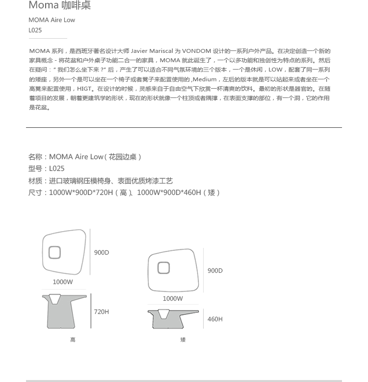 MOMA系列, 是西班牙著名设计大师Javier Mariscal 为VONDOM 设计的一系列户外产品。在决定创造一个新的安博网页版概念-将花盆和户外桌子功能二合一的安博网页版,MOMA就此诞生了,一个以多功能和独创性为特点的系列。然后在疑问:“我们怎么坐?”后,产生了可以适合不同气氛环境的三个版本,一个是休闲的,LOW,配套了同一系列的很舒适的矮座,另外一个是可以坐在一个椅子或者凳子来配置使用的,Medium ,左后的版本就是可以站起来或者坐在一个高凳来配置使用,HIGT。在设计的时候,灵感来自于自由空气下欣赏一杯清爽的饮料。最初的形状是器官的。在随着项目的发展,朝着更建筑学的形状,现在的形状就像一个柱顶或者隅撑,在表面支撑的部位,有一个洞,他的作用是花盆,一个带有VONDOM的自动淋水系统的花盆。其丰富鲜艳的色彩,令这个系列更新鲜,更个性。
