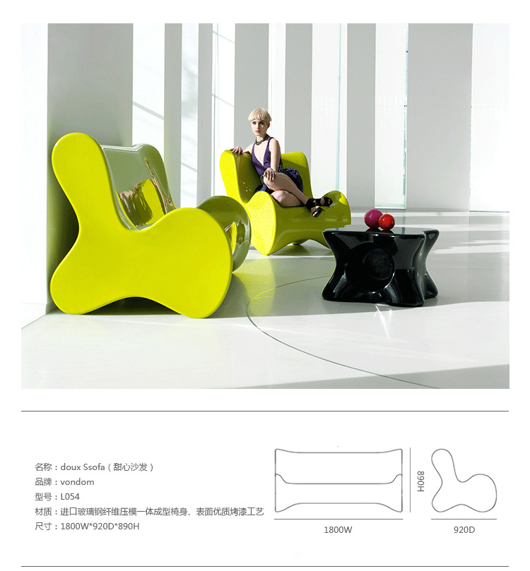 Karim Rashid,当代最耀眼, 最多杰出作品的美国安博anbo(中国),为西班牙VONDOM品牌设计了50个方案的作品,最终,它们归在6个系列。在这6个系列中,最突出的是DOUX系列, 一个器官造形的,友善的,色彩奔纷的。。。手绘出来的自然形状让你想触摸它,坐在它上面,享受它。 多功能性和未来感是这个系列最突出的元素。DOUX的桌子是多功能的 - 当躺下时,它是一张桌子,在中间的位置有一个孔,可以储存东西;当站立时,它变成了一个优雅的花器或一个可以放香 槟或酒的冰桶。