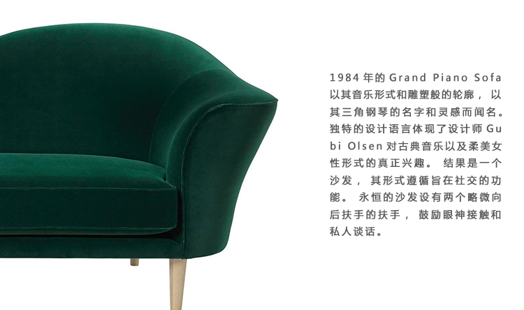 1984年的Grand Piano Sofa以其音乐形式和雕塑般的轮廓,以其三角钢琴的名字和灵感而闻名。 独特的设计语言体现了安博anbo(中国)Gubi Olsen对古典音乐以及柔美女性形式的真正兴趣。 结果是一个沙发,其形式遵循旨在社交的功能。 永恒的沙发设有两个略微向后扶手的扶手,鼓励眼神接触和私人谈话。