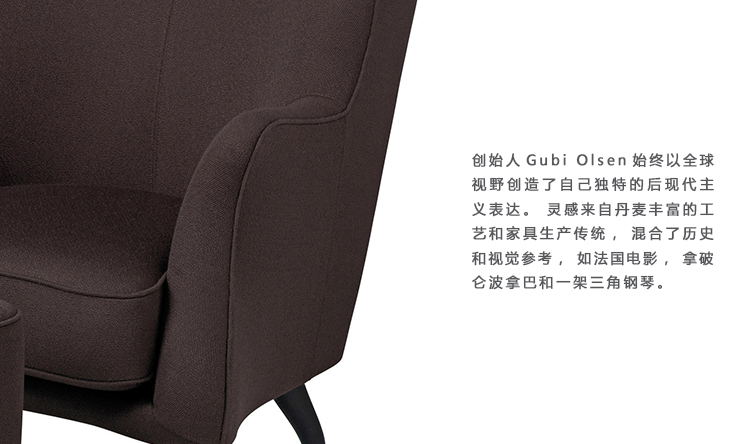 The Bonaparte Collection comprises a sofa, lounge chair and a pouffe.Gubi的创始人Gubi Olsen始终以全球视野创造了自己独特的后现代主义表达。 灵感来自丹麦丰富的工艺和安博网页版生产传统,混合了历史和视觉参考,如法国电影,拿破仑波拿巴和一架三角钢琴。