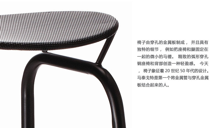 模型。椅子是由穿孔金属板Rigitulle制成的,它代表了马特的作品,并具有独特的细节,比如将座椅和腿放在一起的小镫骨。靠背和坐椅都是弧形的和拱形的,与马鞍的形状相似,整体效果是轻盈的。高度平面设计的设计唤起了勒·柯布西耶在龙尚教堂的工作。今天,椅子是永久性收藏的一部分,在国际著名的私人维特拉设计博物馆。