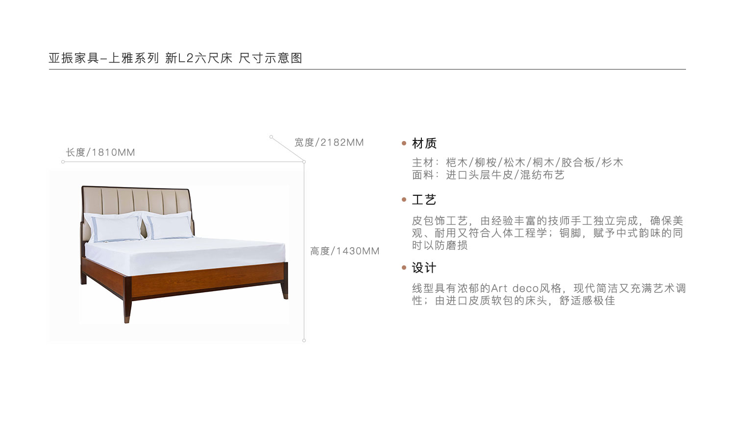 线型具有浓郁的Art deco风格,现代简洁又充满艺术调性;由进口皮质软包的床头,舒适感极佳。