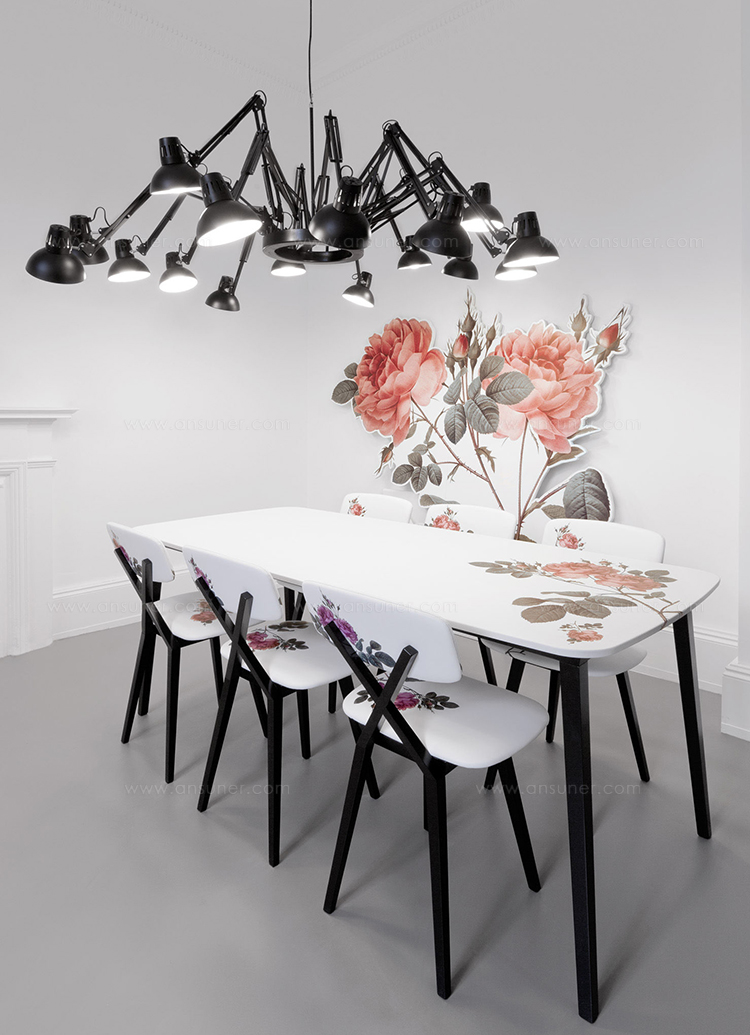“灵感源自粉红玫瑰的经典英国瓷器,这张桌子反映了对高贵历史中几乎被遗忘的价值观和感受的热爱。榉木和skai皮革创造了一种柔软的表面,将传统与创新相结合的强大产品。”