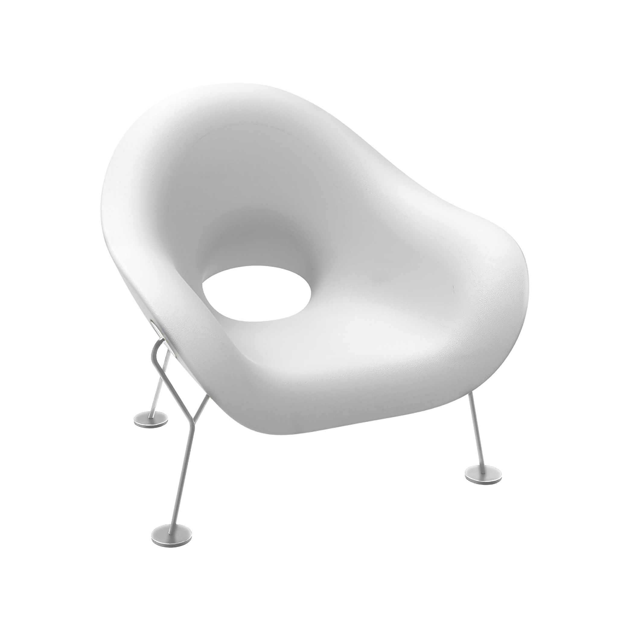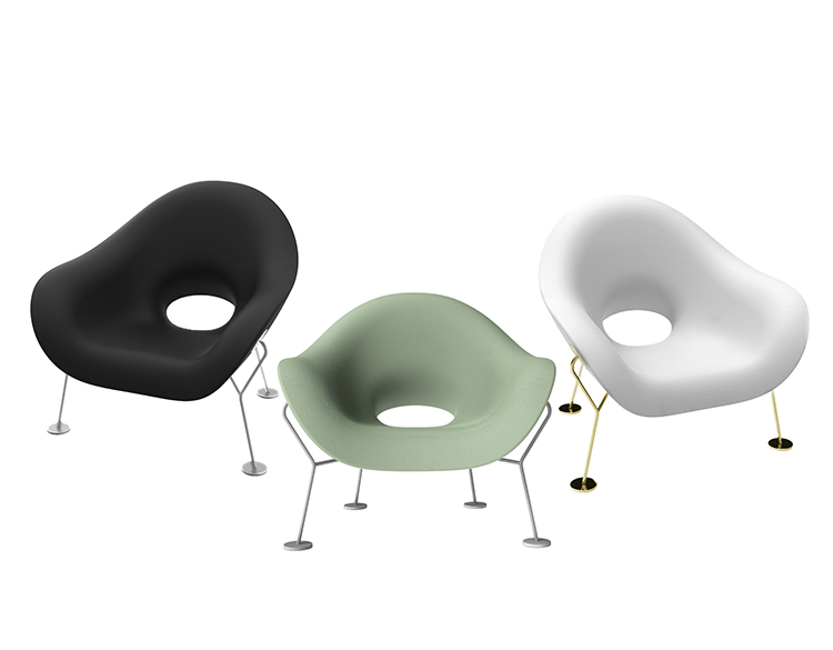 由Andrea Branzi签名的Pupa扶手椅同时具有敏捷和性感。 它倾斜在轻质金属框架上,使体积漂浮在空间中。外型为铬框,内饰为金框。