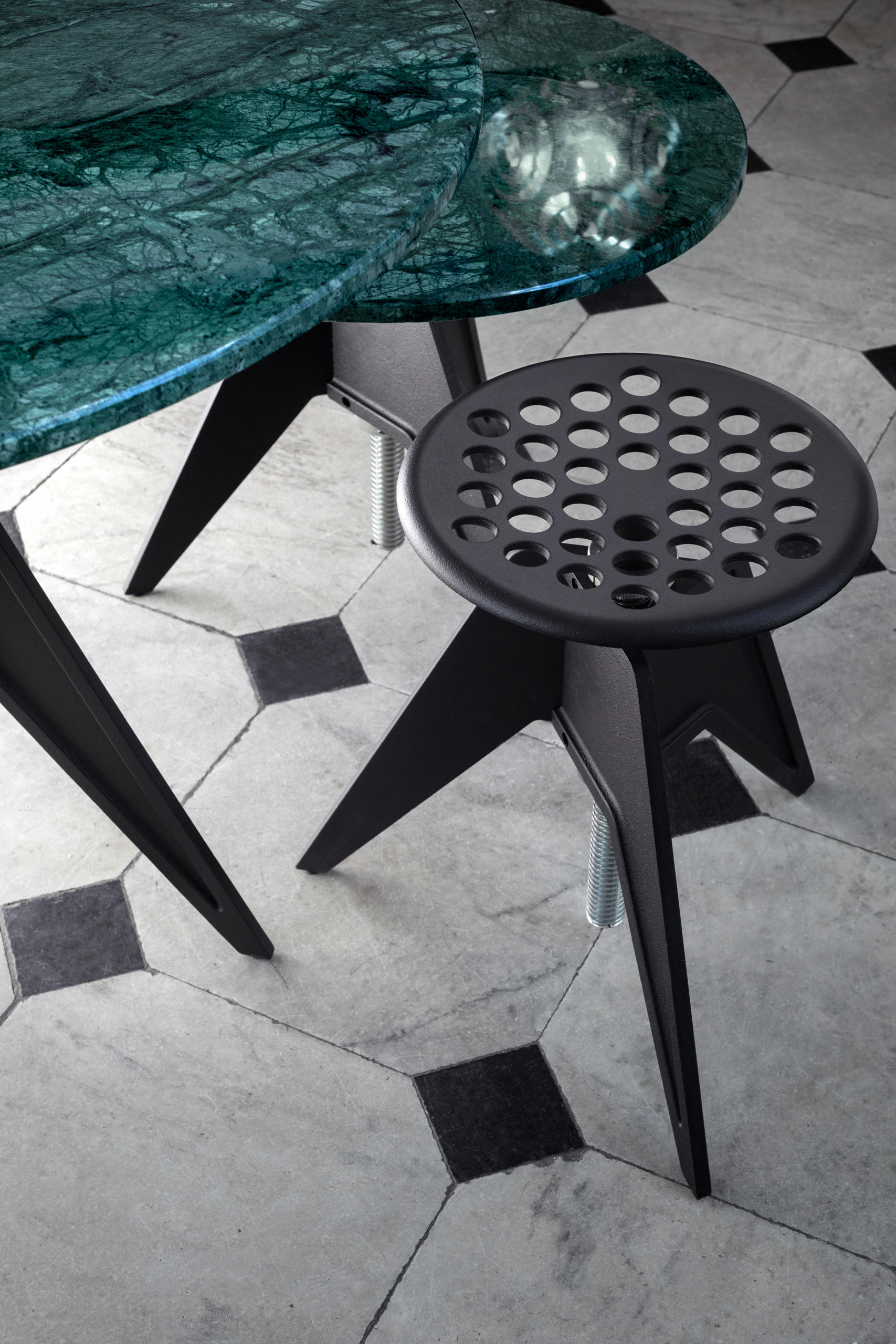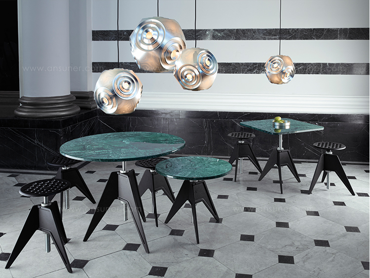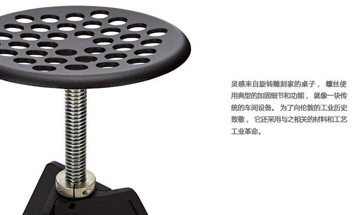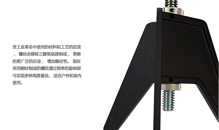 受工业革命中使用的材料和工艺的启发,螺丝由铸铁三脚架底座制成,更新的更广泛的足迹,增加稳定性。 现在采用钢材制成的螺纹通过简单的旋转即可实现多种高度最佳。 适合户外和室内使用。