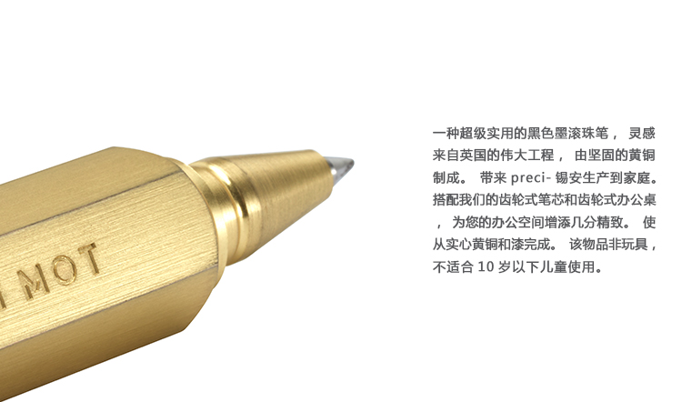 一种超级实用的黑色墨滚珠笔,灵感来自英国的伟大工程,由坚固的黄铜制成。带来preci-锡安生产到家庭。搭配我们的齿轮式笔芯和齿轮式办公桌,为您的办公空间增添几分精致。使从实心黄铜和漆完成。该物品非玩具,不适合10岁以下儿童使用。