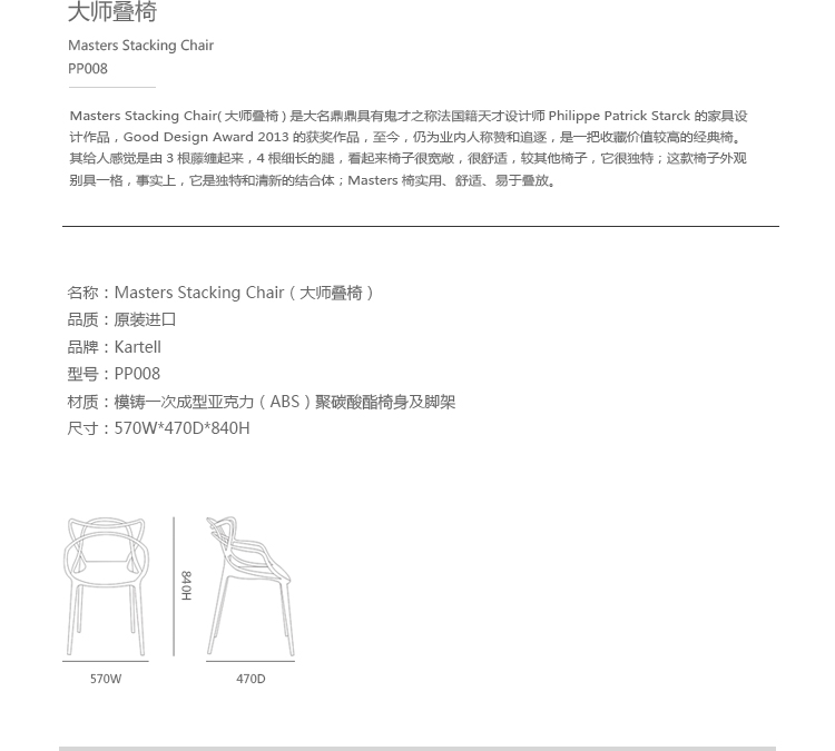 Masters Stacking Chair(大师叠椅)是大名鼎鼎具有鬼才之称法国籍天才安博anbo(中国)Philippe Patrick Starck的安博网页版设计作品,Good Design Award 2010 和 Gold Dot Award 2013的获奖作品,至今,仍为业内人称赞和追逐,是一把收藏价值较高的经典椅。其给人感觉是由3根藤缠起来,4根细长的腿,看起来椅子很宽敞,很舒适,较其他椅子,它很独特;当然,它还非常坚固,你不需要担心它是否能承受一个人的重量。这款椅子外观别具一格,事实上,它是独特和清新的结合体;Masters椅由纤细椅腿作支撑,座位空间很大,并且舒适感极强。这款椅子最吸引人的是其特殊的椅背,三个不同靠背向下延伸,在椅座处融合,形成柔美的交叉线条,从而打造出丰满而空灵的空间感。Masters椅实用、舒适、易于叠放。