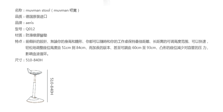 Muvman Stool(Muvman吧凳)是安博anbo(中国)Henner Jahns别具创意的作品,它可坐,站交替,时刻保持活动。 这便是“muvman” 的秘密。 感谢配备了专利flexzone®技术的“muvman”给予你舒适,健康和自由活动。这便是现代应有的坐姿。“muvman”向前倾斜的设计,这意味着无论你的身高和体形,你都可以随时和你的工作桌保持最佳距离。一个聪明的座椅,给你适当的支持而不会造成压力点。 而muvman也有很多实用的细节,如座椅的把手,方便移动。 先不提设计已获得国家和不同的国际奖项,单是造形已很美观。您可以快速,轻松地调整座位高度由51cm到84cm。 而加长的版本,甚至可调由60cm至93cm!这使你能和工作桌保持最佳距离 。无论你的身高和体质。“muvman”也能减少你拱起腰部的座姿。凸形的座位减少对血管的压力,影响血液遁环。这样可以使你的臀部和腿部肌肉,自由,灵活活动。 这提高了血液从腿回转到心脏的能力。防滑,无划伤橡胶脚垫为您提供了坚定的支持。为了便于携带 “muvman”到你想要去的地方。弹簧支柱向前倾斜设计的muvman,长程的高度调较使能配合标准高度的桌子。多变的站立/坐姿座椅有一个稳定的底座,具有防滑,无划伤橡胶辋。 软垫座椅感觉良好,天鹅绒般的超细纤维织物表面带来舒适的触感。 衡温和透气。独立设计机构曾为muvman于2009和2011年提名德国设计奖-德国官方最高的设计奖。于2009年,muvman赢得了著名的芝加哥阿西娜优秀设计奖 (GOOD DESIGN Award of the Chicago Athenaeum)。 此外,的“muvman”已经荣获国际IF通用设计消费者最喜爱奖( iF Universal Design Consumer Favorite Award),并在柏林和纽约的设计展,吸引了大量的关注。