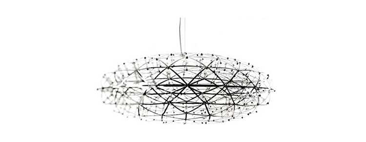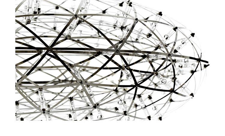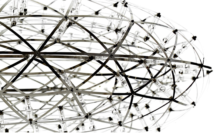 "The Raimond lamp:a perfect sphere of mathematical ingredients punctuated by tiny led lights. Looking at the lamp feels like staring into the soft glow of a starry night. Into the essence." Material: Stainless ‘spring steel