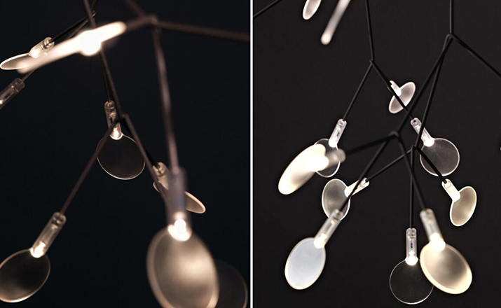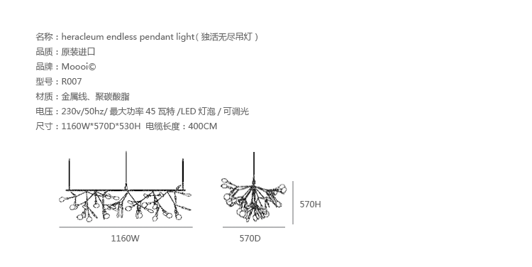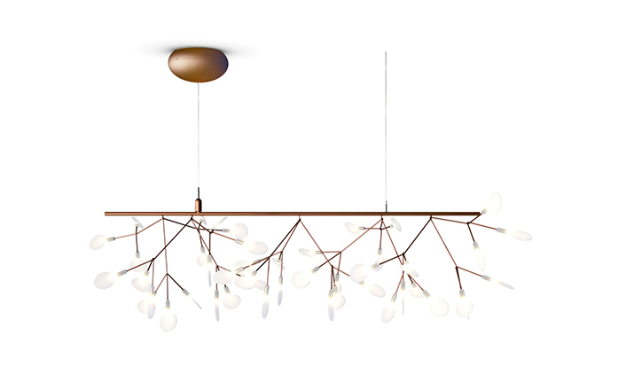 "Decorative LED lamp from Moooi inspired by the Heracleum Plant.The Heracleuom Endless pendant light is a perpetual blossom of new branches that can be added to by the meter. The possibilities are almost limitless by combining straight lines, angles and corners.'Leaves' splay out from 'stems' creating a very technical but natural structure. This pendant light design is created by using the technique of coating conductive layers which would not be possible with normal wires.The Heracleum 'leaves' are not frozen in one position. They can be freely re-positioned by rotating them around their stem. Heracleum includes a new LED which is much more efficient while providing unique and sparkling illumination.Metal wire frame available in a copper or nickel finish (see images) , polycarbonate lenses, steel canopy. Complete with 4m translucent cables.Dimmable with mains voltage dimmer (dimmer for incandescent, halogen). Please make sure to use a dimmer rated for a low power luminaire.Heracleum now includes a new LED that allows endless technical possibilities, making this new version much more efficient while providing unique and sparkling illumination.Available as 116cm sections with 2 types of connector, either 90 or 135 degrees or with end cover set. 2 suspension wires for each section. Canopy - 1 per section in matching finish, copper or nickel."