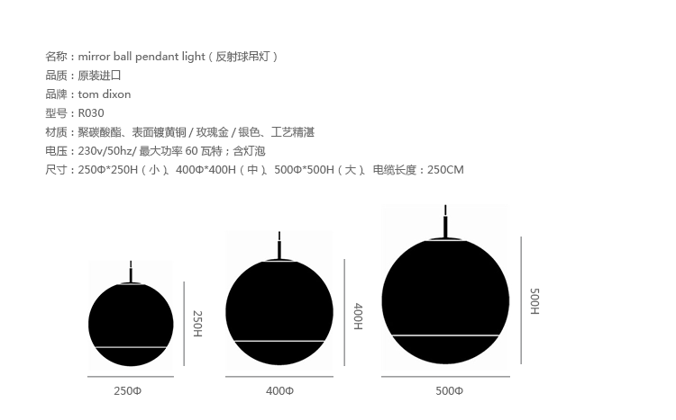 "A highly reflective shade inspired by the space helmet. The Mirror Ball is created by exploding a thin layer of pure metal onto the internal surface of a polycarbonate globe. This has become one of the most iconic products in the Tom Dixon collection. Offered in two sizes.The Fat Spot Light was manufactured using a special vacuum metallization process which has been developed over a number of years by Tom Dixon in partnership with their factory. The technically complex nature of this process (i.e applying a very thin layer of real metal to the internal surface of a polycarbonate form, which is then UV coated) requires highly skilled workers, specific machinery and clean environments to meet demanding quality levels. Metalized polycarbonate products must only be stored & installed in temperature controlled environments to preserve the quality of the product. Please take greater care when handling and installing.