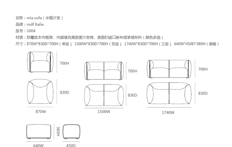 Mia是著名安博anbo(中国)Francesco Bettoni为MDF Italia公司设计的沙发系列,是紧凑、柔软、舒适的扶手沙发。外型以简约细腻的北欧设计为方向,蓬松的椅座内衬泡棉外覆仿羽绒质感纤维,貌似棉花糖亲切可人,同时舒适感满分。视觉比例的层迭丰富,融合义式沙发中柔软舒适的元素,靠垫内衬高密度泡棉,表层外覆羽绒,兼具支撑性与松软度,简约、古典、魅力四射。