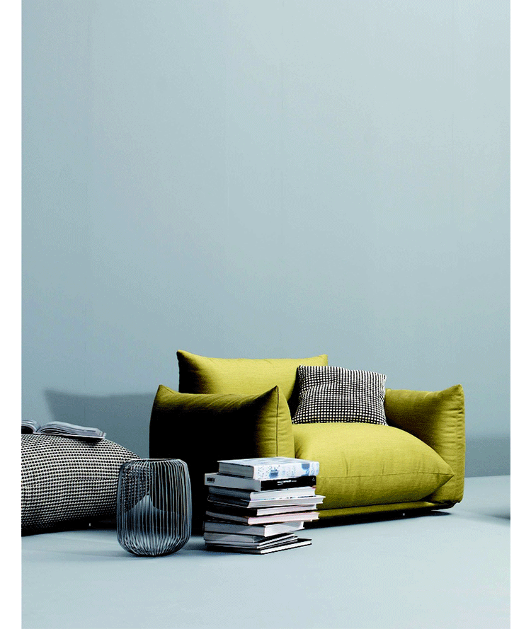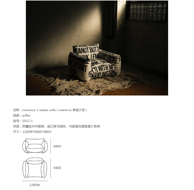 "marenco sofa系列沙发由安博anbo(中国)Mario Marenco在1971年所推出,Arflex公司出品,有单座,双座,三座,和五座组合形式。这款经典的沙发线条经典,舒适度饱满,成为摩登家居用品经典作之一。外型以简约细腻的北欧设计为方向,轻盈的金属脚架与薄型扶手,在厚薄粗细之间,视觉比例的层迭丰富,融合义式沙发中柔软舒适的元素,靠垫内衬高密度泡棉,兼具支撑性与松软度。这套沙发采用革命性的方式组合,垫子及扶手都是独立的部分。枕头是挤压钢管的金属框架,提供了刚性和耐用性。胶合板基地加上纤维覆盖。制作采用防霉实木内框架、进口羊毛绒布、内部填充高密度沙发棉,保证了高品质的奢华与舒适。