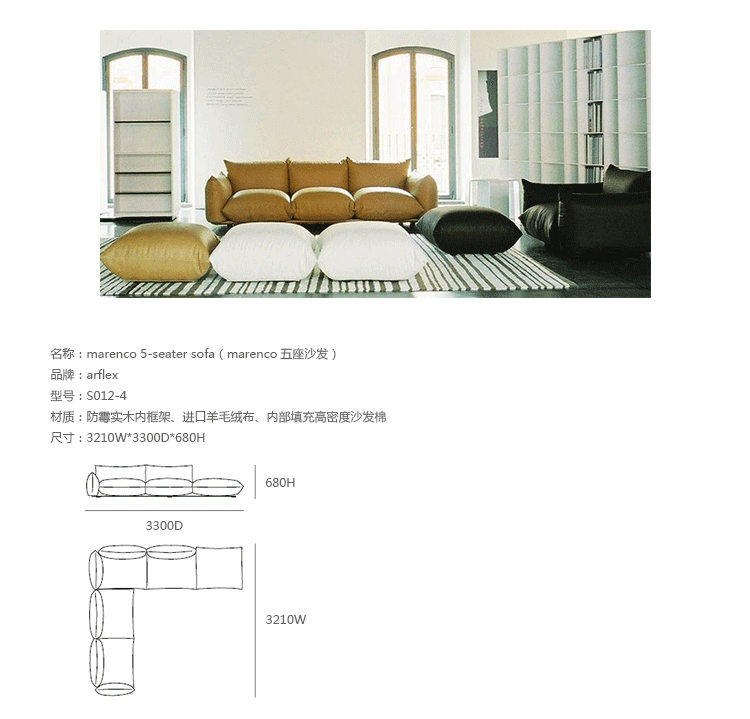 "marenco sofa系列沙发由安博anbo(中国)Mario Marenco在1971年所推出,Arflex公司出品,有单座,双座,三座,和五座组合形式。这款经典的沙发线条经典,舒适度饱满,成为摩登家居用品经典作之一。外型以简约细腻的北欧设计为方向,轻盈的金属脚架与薄型扶手,在厚薄粗细之间,视觉比例的层迭丰富,融合义式沙发中柔软舒适的元素,靠垫内衬高密度泡棉,兼具支撑性与松软度。这套沙发采用革命性的方式组合,垫子及扶手都是独立的部分。枕头是挤压钢管的金属框架,提供了刚性和耐用性。胶合板基地加上纤维覆盖。制作采用防霉实木内框架、进口羊毛绒布、内部填充高密度沙发棉,保证了高品质的奢华与舒适。
