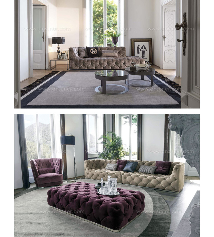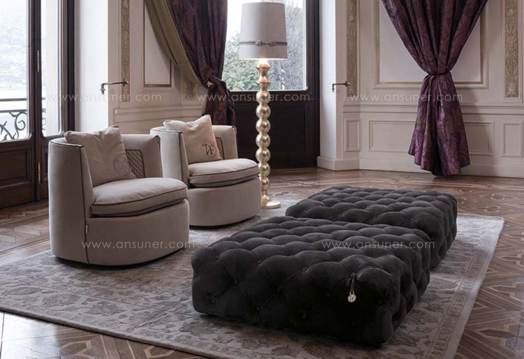 沙发表面覆盖皮革,基底颜色是黄金色,按扣在同一材料的封面.