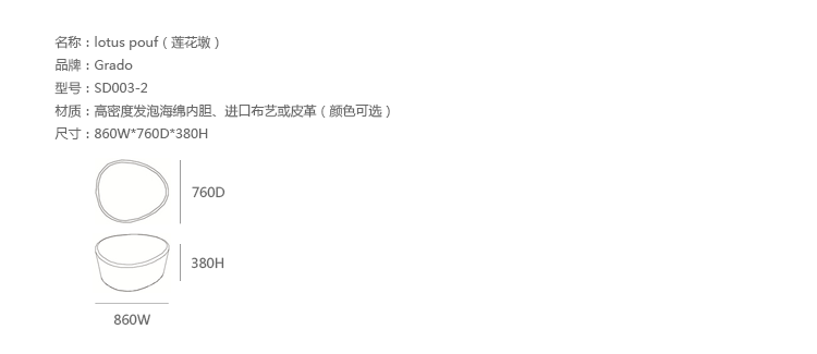 有时,它不是从零开始,Lotus Pouf(莲花墩)的设计灵感来着西湖的荷叶。它不张扬与但充满活力。Grado(歌德)设计这款莲花墩的目的是唤醒人与自然之间平衡的认知。这系列有三种尺寸和高度,多种使用方式,适合于不同大小的空间,如会议室、 会议活动的多功能厅,亦或是教室和放松的休闲区。圆形和椭圆形的形状的集合将原始设计结合多种功能︰主要用于商务会议和现代餐饮领域。莲花墩的制作使用了防霉实木内框架或玻璃钢内胆、高密度海绵、进口布艺或皮革(颜色可选)。