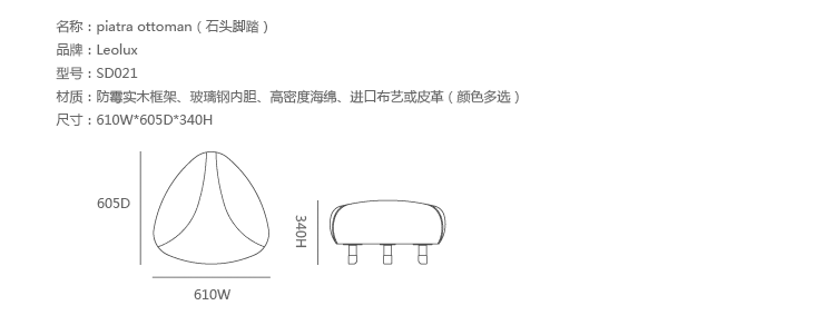 Piatra Ottoman(石头脚踏),安博anbo(中国)Norbert Beck的作品。这款石头造型的脚踏,看着是不是很想驻足休憩?其有着特色的缝合线,Piatra Ottoman(石头脚踏)通过选择曲面、 边角料或不同颜色,无论从任何角度欣赏都是不一样的,就好比这世界上没有任何两块相同的石头,Piatra Ottoman(石头脚踏)是独一无二,与众不同的。制作采用高密度发泡海绵内胆、进口布艺或皮革(颜色多选)。