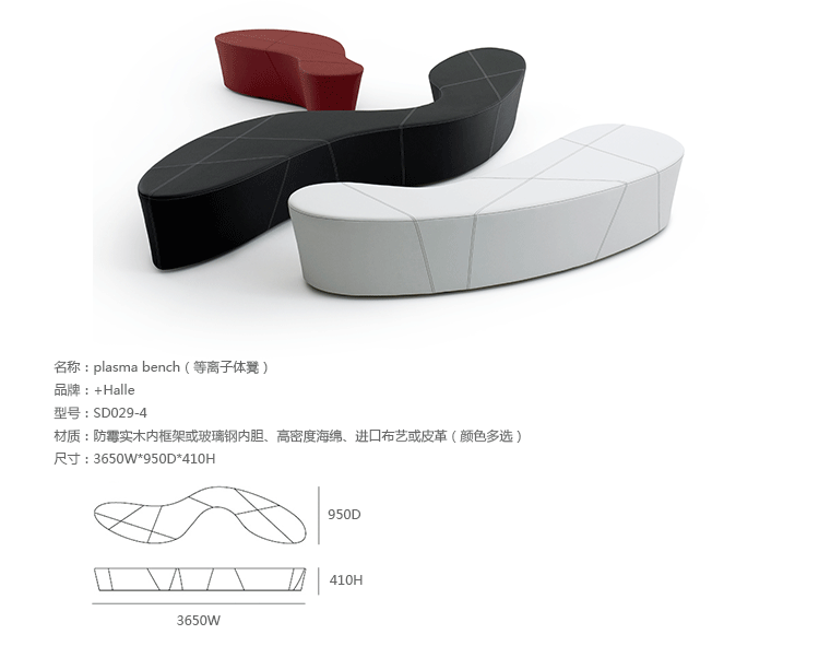 Plasma bench(等离子体凳)是丹麦安博anbo(中国)busk+ hertzog为Halle品牌创作的。Plasma是一个弯曲的概念性的公共座椅。等离子体凳的功能性能非常完美的融入环境,可以单独使用,也可以以不同的组合形式去营造独特、与众不同的空间。4种不同大小尺寸使之很容易表达功能性和各种可能性。最大的等离子体凳超过三个半米长,同时允许多达 10 人的就坐。有机的形状在功能性上表现出强烈的优点,例如大家可以面对面,也可以背对背,可以保持近距离交流,也可以保持一定的私人独立空间。可选的对比拼接提供独特的创造性的组合。Plasma bench(等离子体凳)是IF Design Award和The Good Design Award获奖作品。