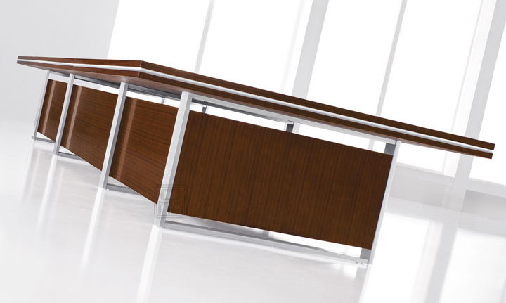 ※ 上图为会议桌角度展现,此款会议桌木纹鲜明,配以银色为点缀,独特的线形设计韵含了一种灵气,使人眼前一亮。多元化的桌面设计能满足您各种组合变换、空间互补的要求。