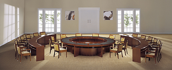 ※ 实木的会议桌由传统的板形基座承托,桌边微弯,与人坚稳厚重之感;外围为弧形的会议条桌!