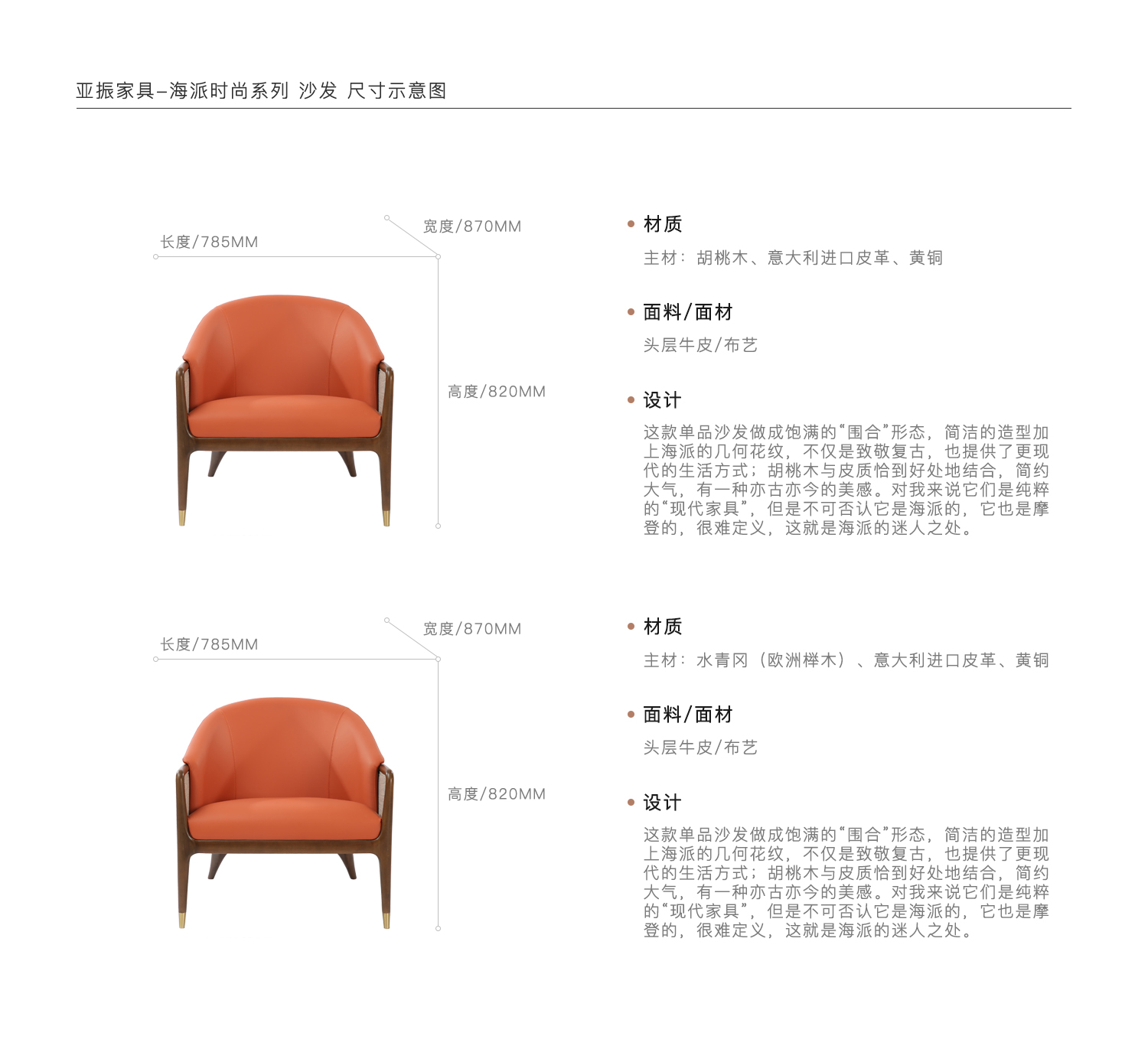 这款单品沙发做成饱满的“围合”形态,简洁的造型加上海派的几何花纹,不仅是致敬复古,也提供了更现代的生活方式;胡桃木与皮质恰到好处地结合,简约大气,有一种亦古亦今的美感。对我来说它们是纯粹的“现代安博网页版”,但是不可否认它是海派的,它也是摩登的,很难定义,这就是海派的迷人之处。