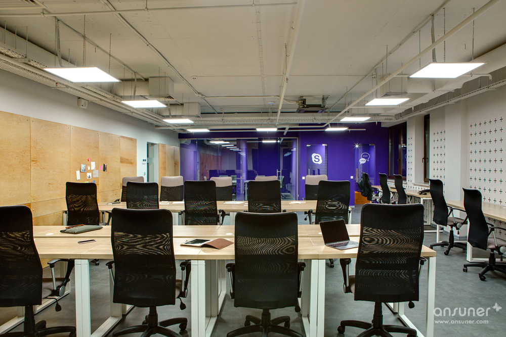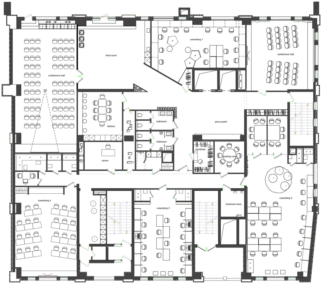 三层主要用作联合办公空间,配有会议室、skype视频聊天室、以及几间专题会议室。这里还配以开放而流动的新闻中心、以及采用接待区的格调布局的商务洽谈区。在这个洋溢着极简工业美学的工作空间里,设计团队运用了大量的创意吸引创业者,如鲜明饱和的色彩点缀、大量的创意图形与文字设计等。