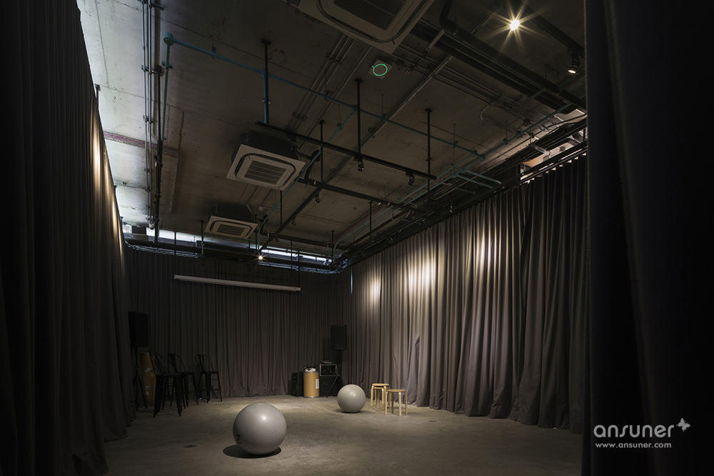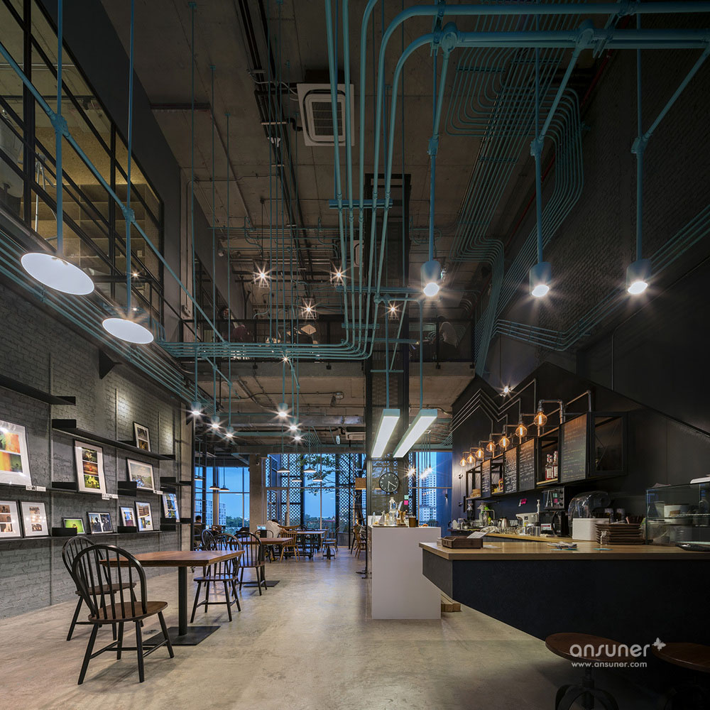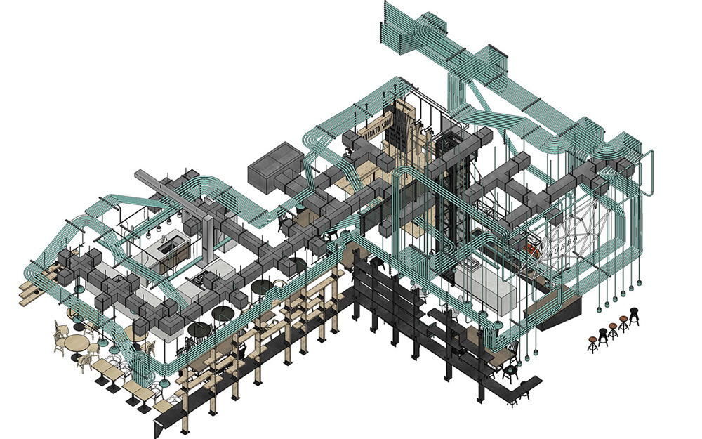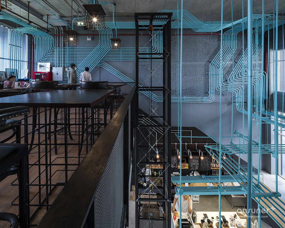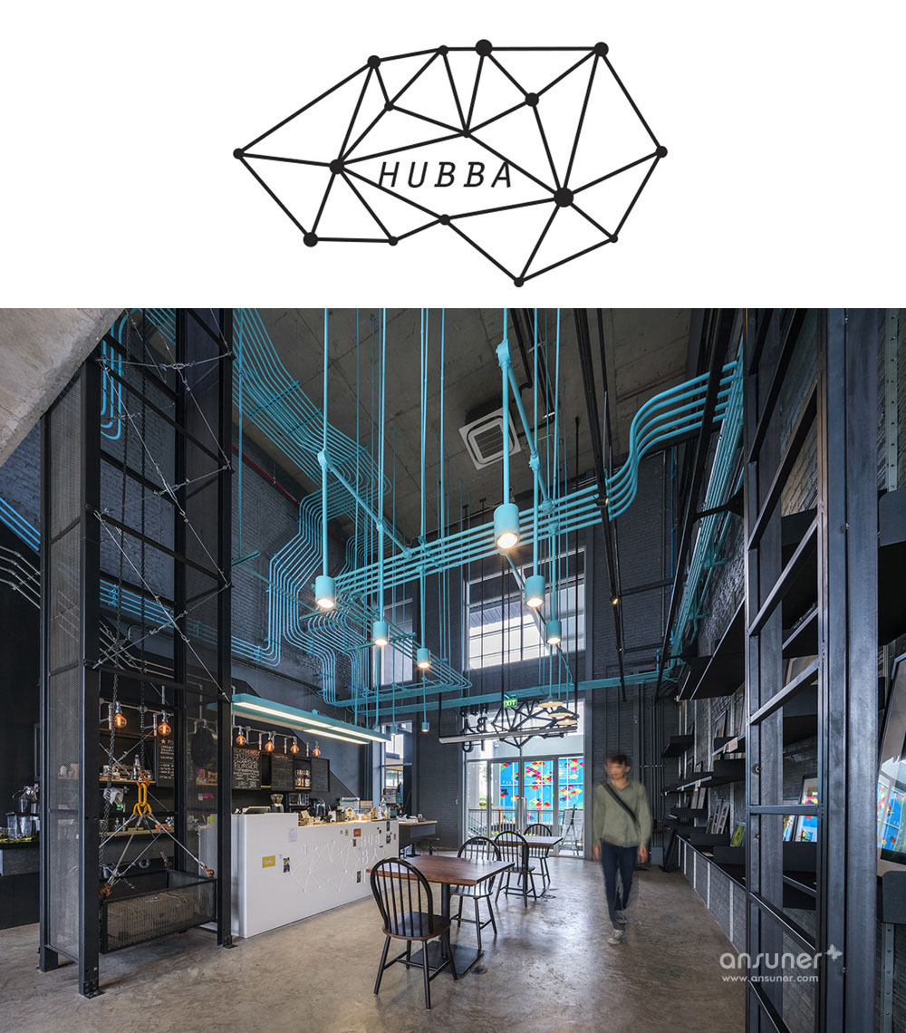 Hubba-to的创意灵感源自于Hubba的网络状标志图形,设计强化并延续这种网络线条,将其演化为有趣的空间元素,蔓延穿梭于一至二楼从而形成统一的视觉空间。这样的构想之所以能实现,是因为现实施工中确实存在许多的机电设备管线。Supermachine设计团队只要善加利用这些管线、并刻意强化增加管线系统、然后有目的的设计组织管线安装路径。纵横交错的管线一律喷成漂亮的绿松石色彩,流畅的蓝绿色管道在墙面、天花、空间中婉转穿梭,营造出令人震撼的视觉效果,为沉重的工业风带来灵动和创新。