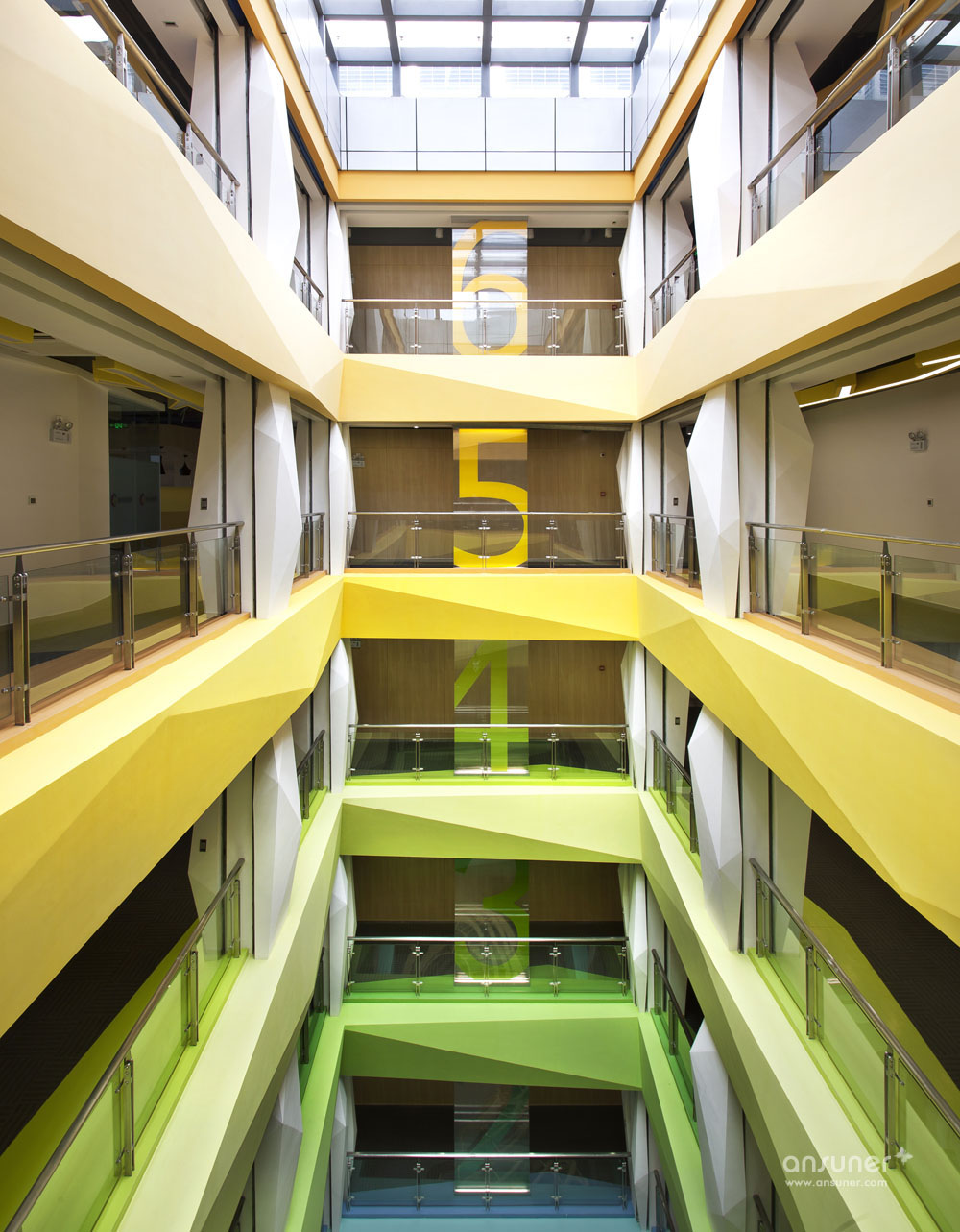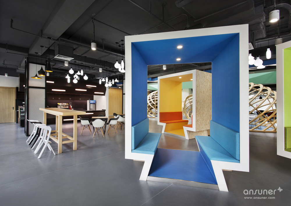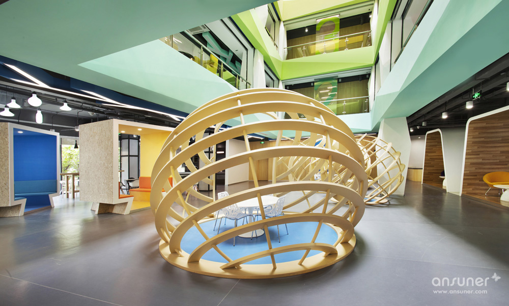 整个中庭为本案的亮点。安博anbo(中国)利用建筑的结构优点,并为了更好地展示出每层的特色,采用了腾讯文化中的几个主色调,不同的色调代表着每层的空间色彩效果。为了使中庭的空间感更为突出并结合设计理念中的造型元素,每层楼板外立面及柱体,都运用了立体式折线的效果。从中庭对应的一楼休闲区也设计了三组采用地球轴线组合而成的有趣的休闲讨论区,既有开放的效果,又有一定的分割隐私作用。