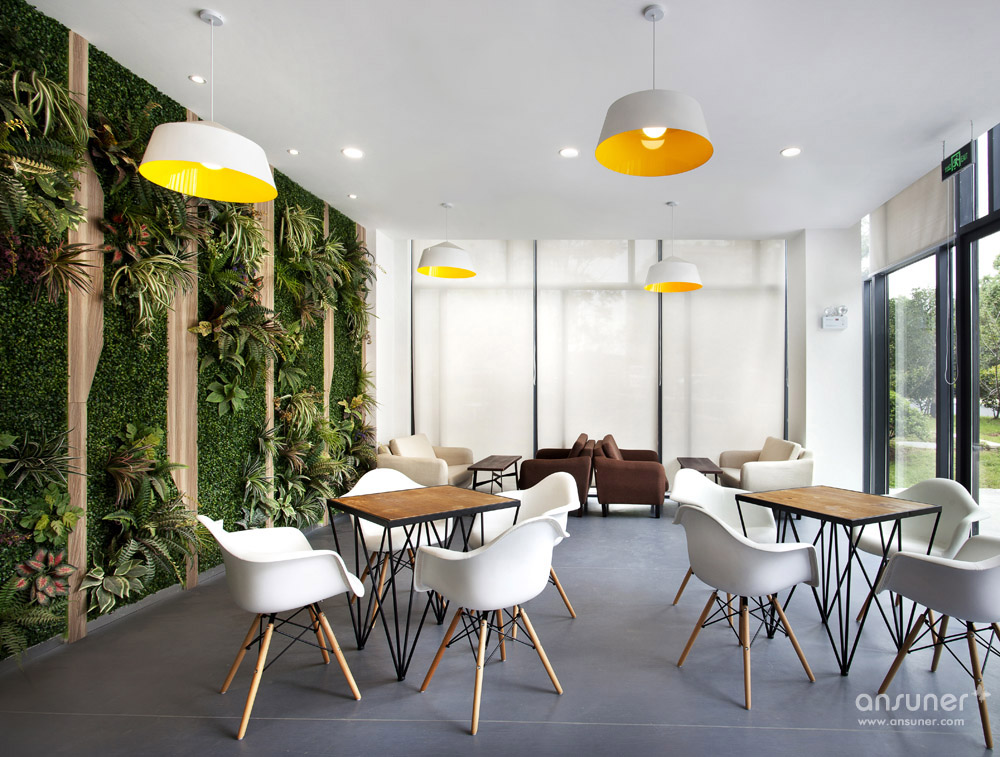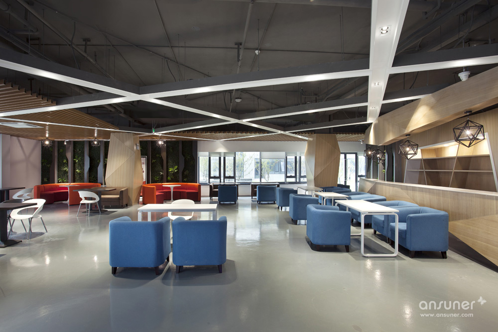 在一楼的沿窗休闲讨论区里,整面墙采用绿植装饰,与室外的绿化相呼应。咖啡厅的效果以简洁为主,地面采用了耐磨及耐清洁的灰色调地坪漆,安博网页版及材料的选择也以暗色调为主,以迎合咖啡的色调。办公区内的茶水区是员工讨论休闲的区域,整个色调的运用营造出温馨放松的空间氛围。