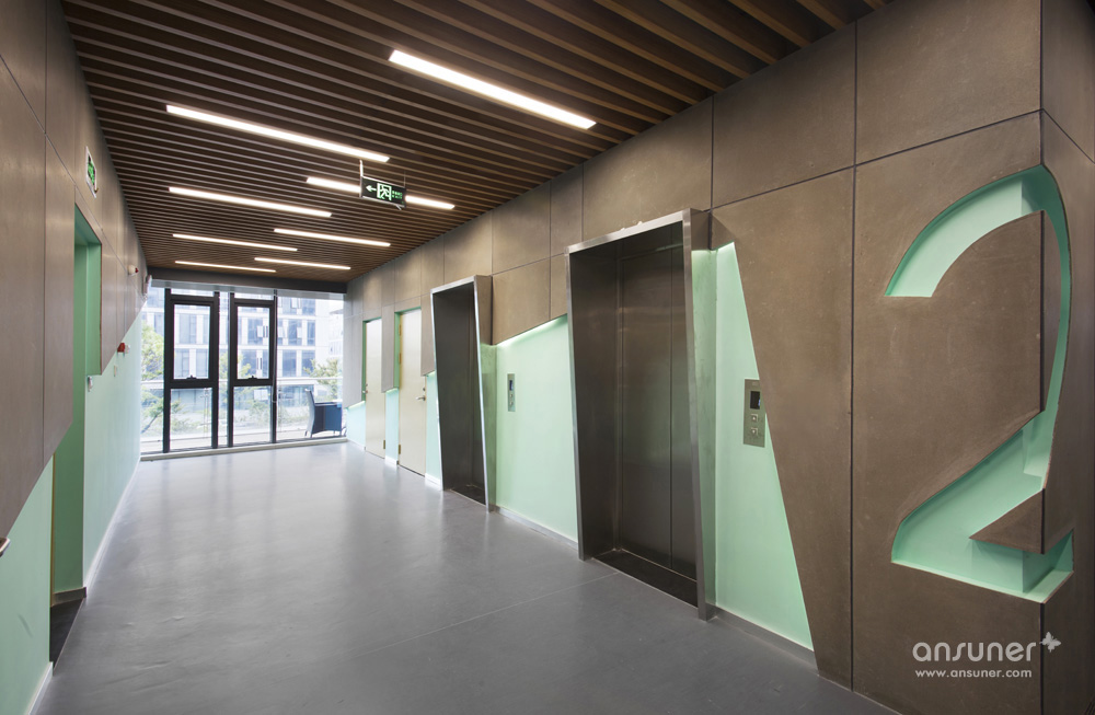 每层的电梯厅都会有统一风格造型的LOGO展示墙及放大式表现效果的楼层标识,稳重中透着活泼、时尚之感。