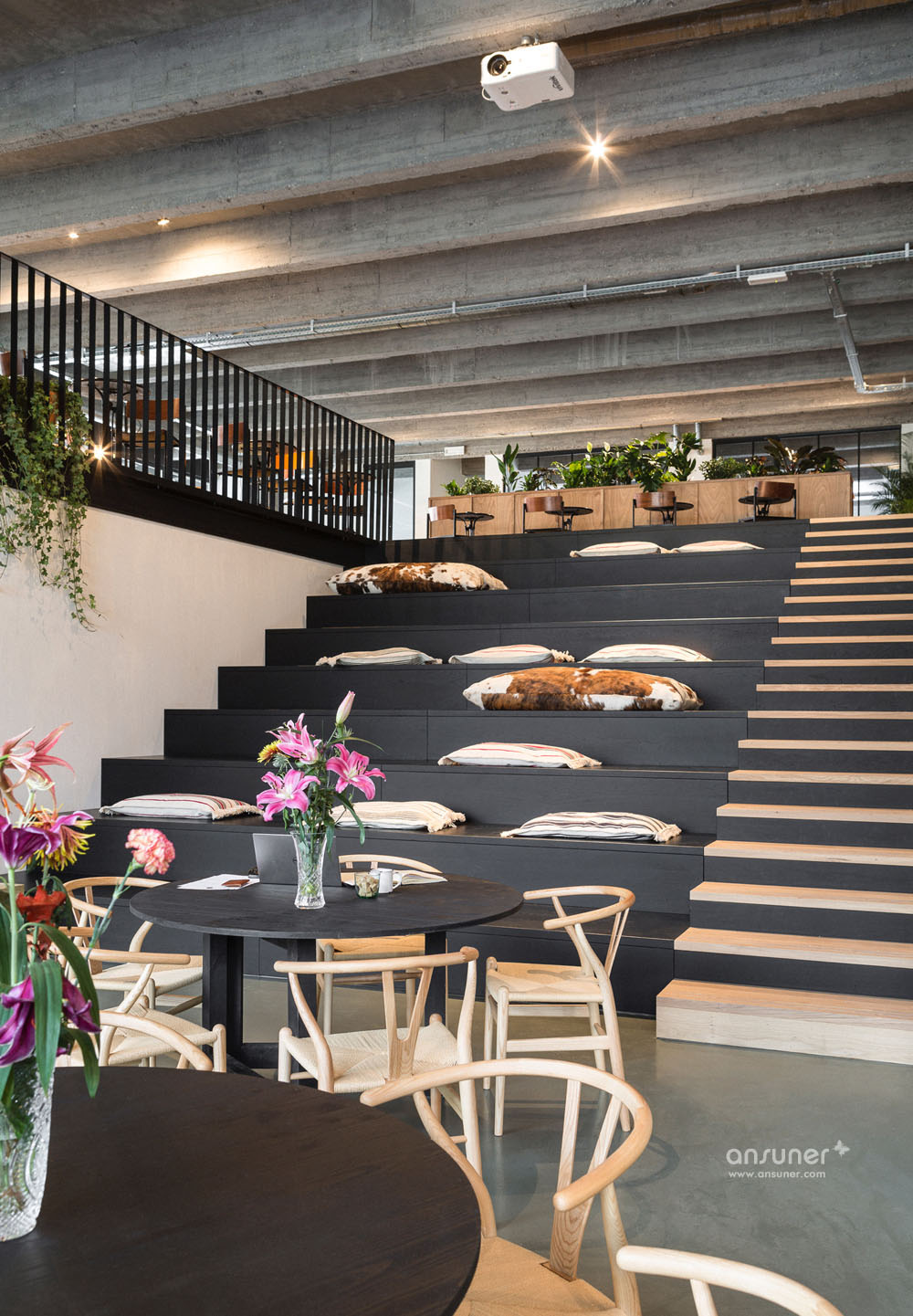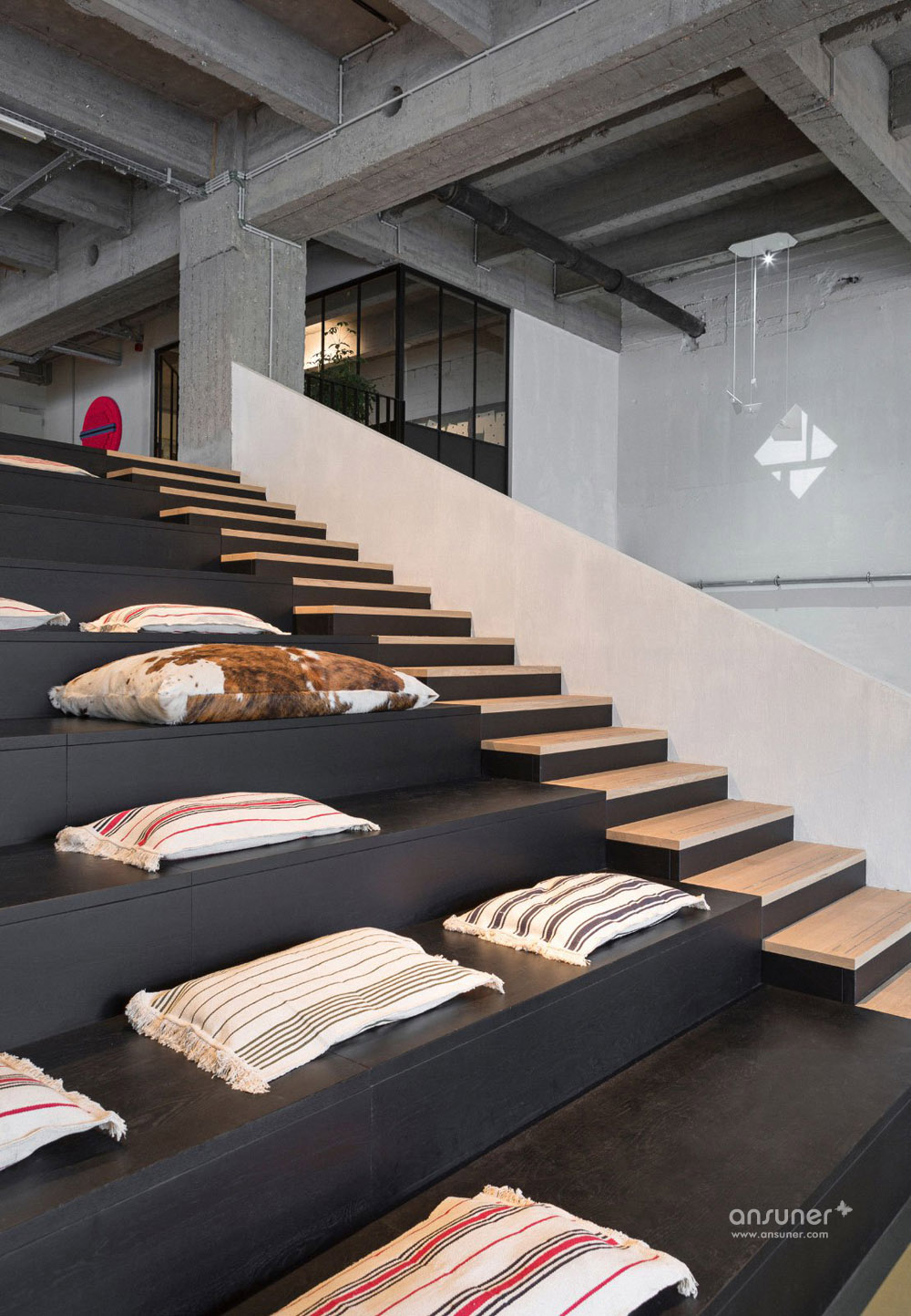 这里犹如公园一般带来各种惊喜。你可以散步到酒吧在这里停留伫足、也可以在绿荫中工作、或者在图书馆里随意翻阅、亦或在舒适的软椅里来个葛优躺(时尚办公网的小伙伴们笑了)、欣赏着阶梯上的风景。