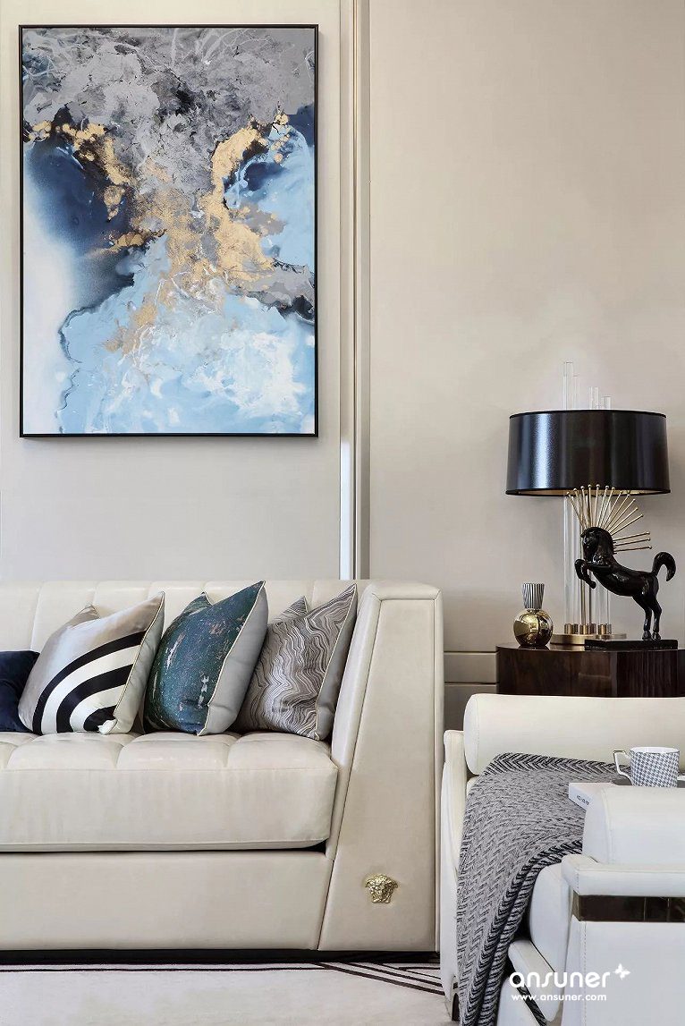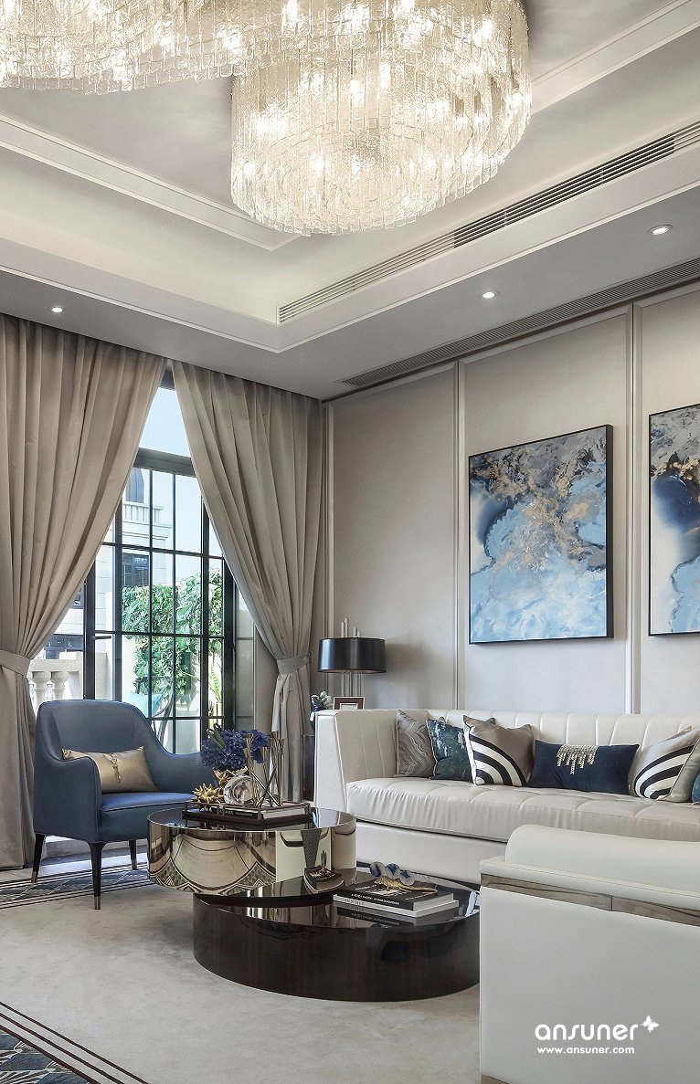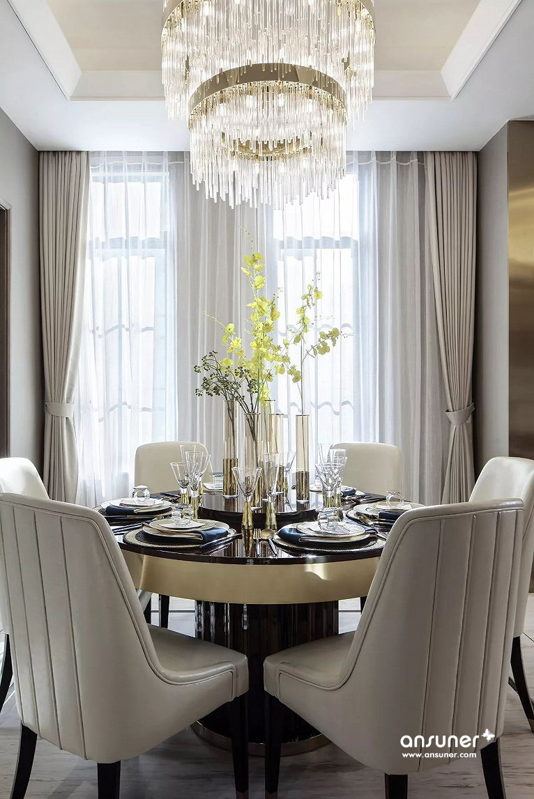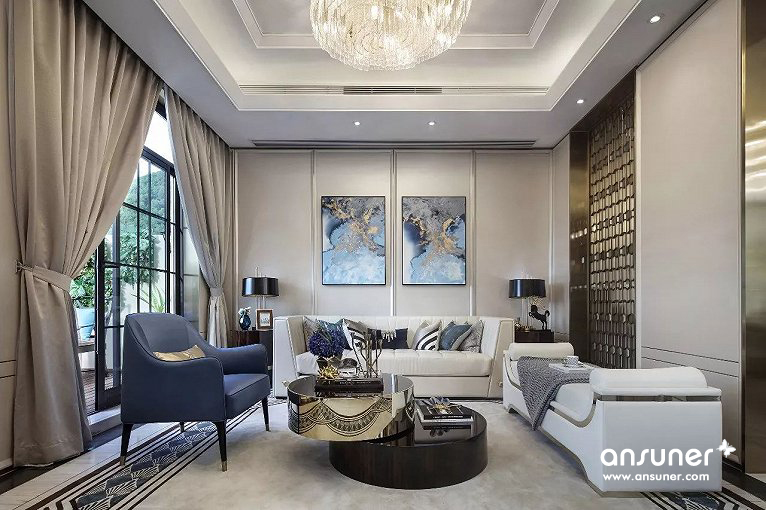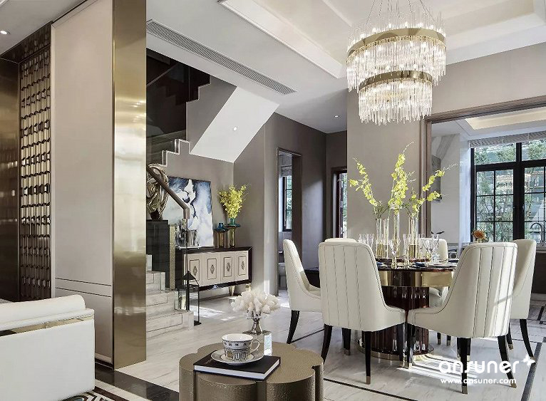 客厅整体空间为浅色系,线条简洁硬朗,象牙白的背景色,奠定了空间低调的质感、优雅的基调。安博anbo(中国)采用大量高级皮质材料,巧妙搭配自然质感的石材以及金属元素,璀璨的金色和几何经典,给予色彩最大的礼赞。流光溢彩的水晶吊灯尽显奢华,恰如一个浪漫的音符,赋予空间生动轻灵的魅力。
