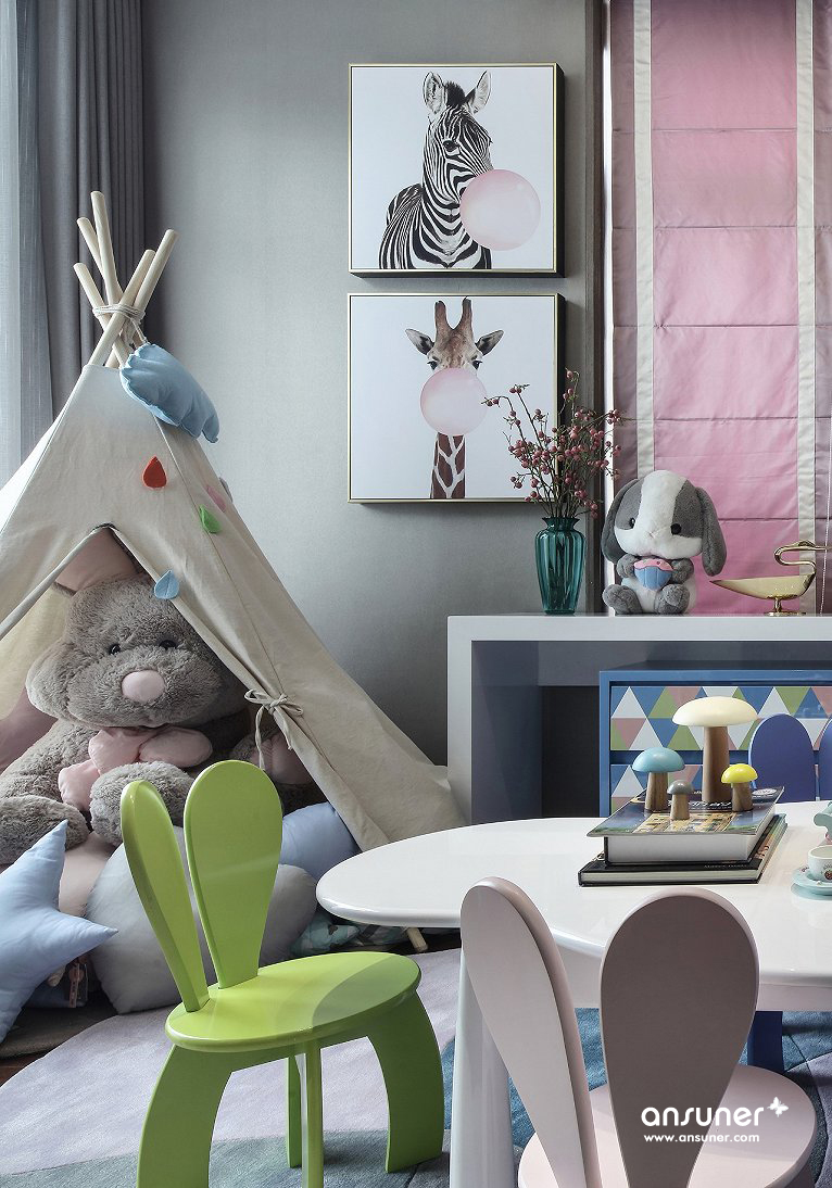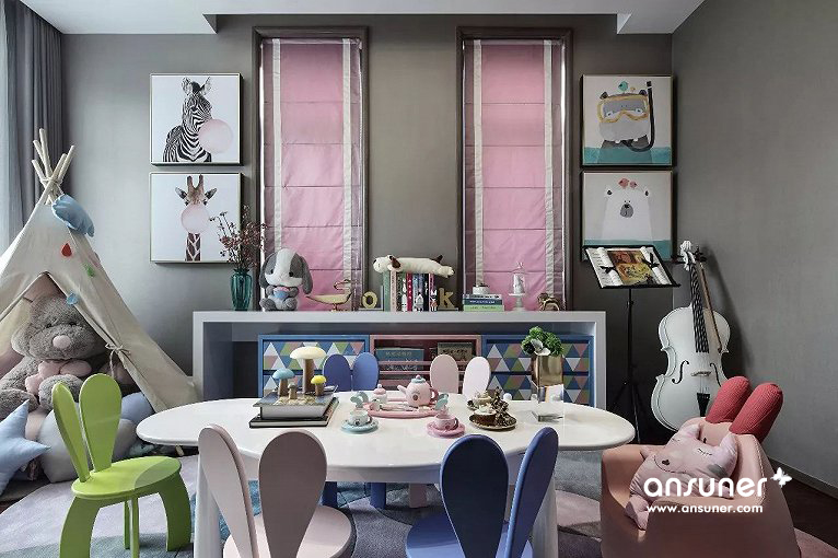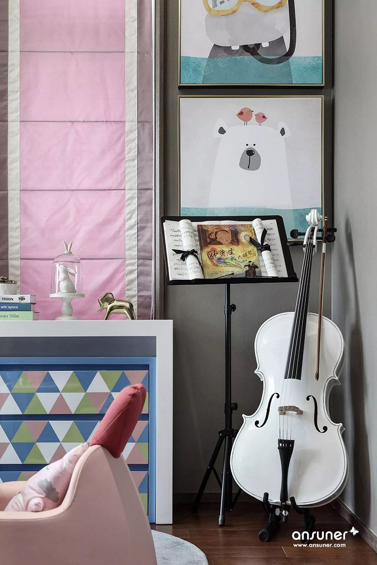 安博anbo(中国)专门打造了一个亲子娱乐空间,解决了许多家庭困扰不已的问题,有了这个功能独特的独立小空间,孩子乱丢玩具或者扰乱家庭陈设秩序的情况大大减少。设计不仅注重“童趣”,也添加了艺术氛围的营造,以音乐、小提琴为主题,辅以画画、阅读、游戏功能,整个空间充盈着甜蜜欢快的调调。