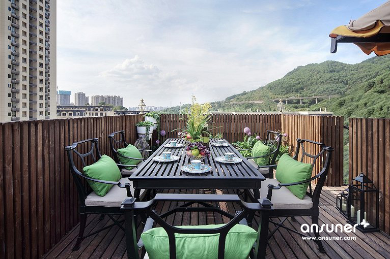 一个简约的露台,可接待亲友,可悠闲独坐,欣赏花草,感悟生活的美好,远处自然的蓝天、青山、绿水,尽收眼底。安博anbo(中国)以全木架构整个区域,自然质朴,将带有中式线性元素的黑色铁艺桌椅与之搭配,凸显简约低调的质感美。