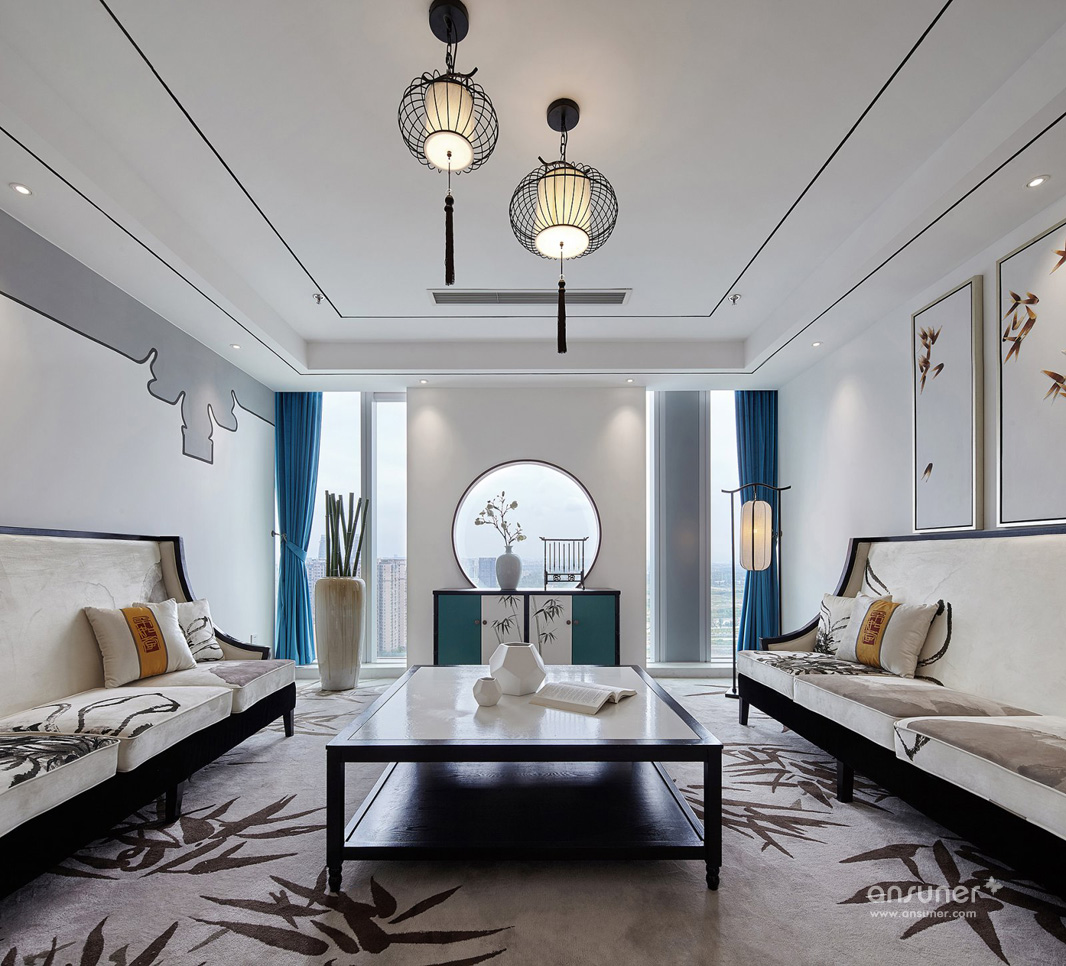 空间造型与整体结构与传统文化风水学相符。“天圆地方”的空间结构暗合天人合一的传统文化精髓,天地互为感应,其中人被视为天地万物之灵,能够感通万物,最灵者也。前厅以“山”形为背景,地面设置“水”景,意喻有山有水,藏风聚气,山水相通,气运不绝。
