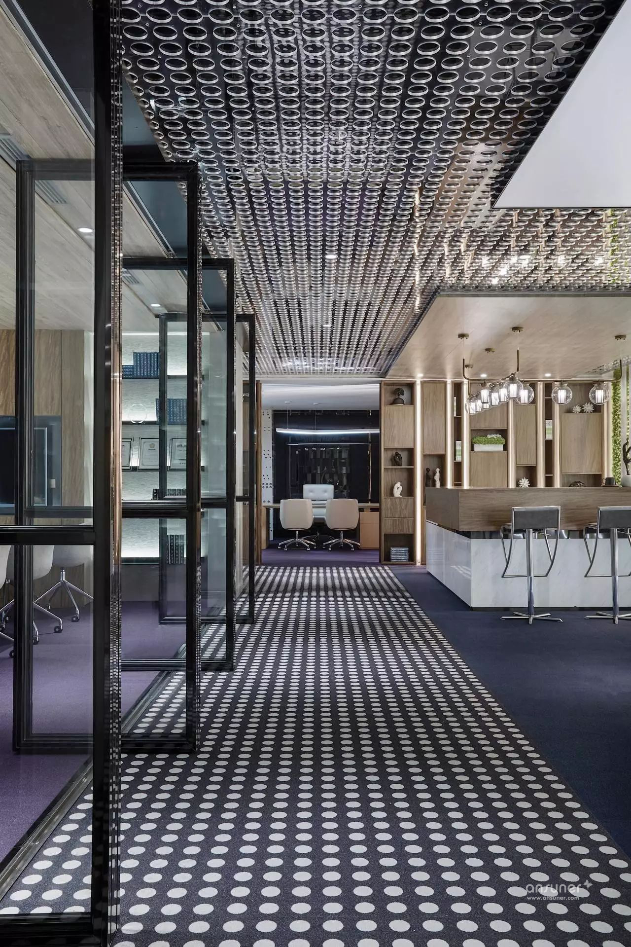 安博anbo(中国)运用石材、金属、木饰面结构穿插的巧妙手法呈现出多功能接待厅、接待台、水吧区的现代感与创新性 。