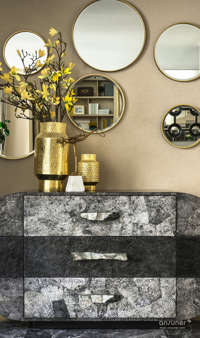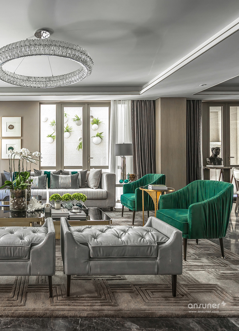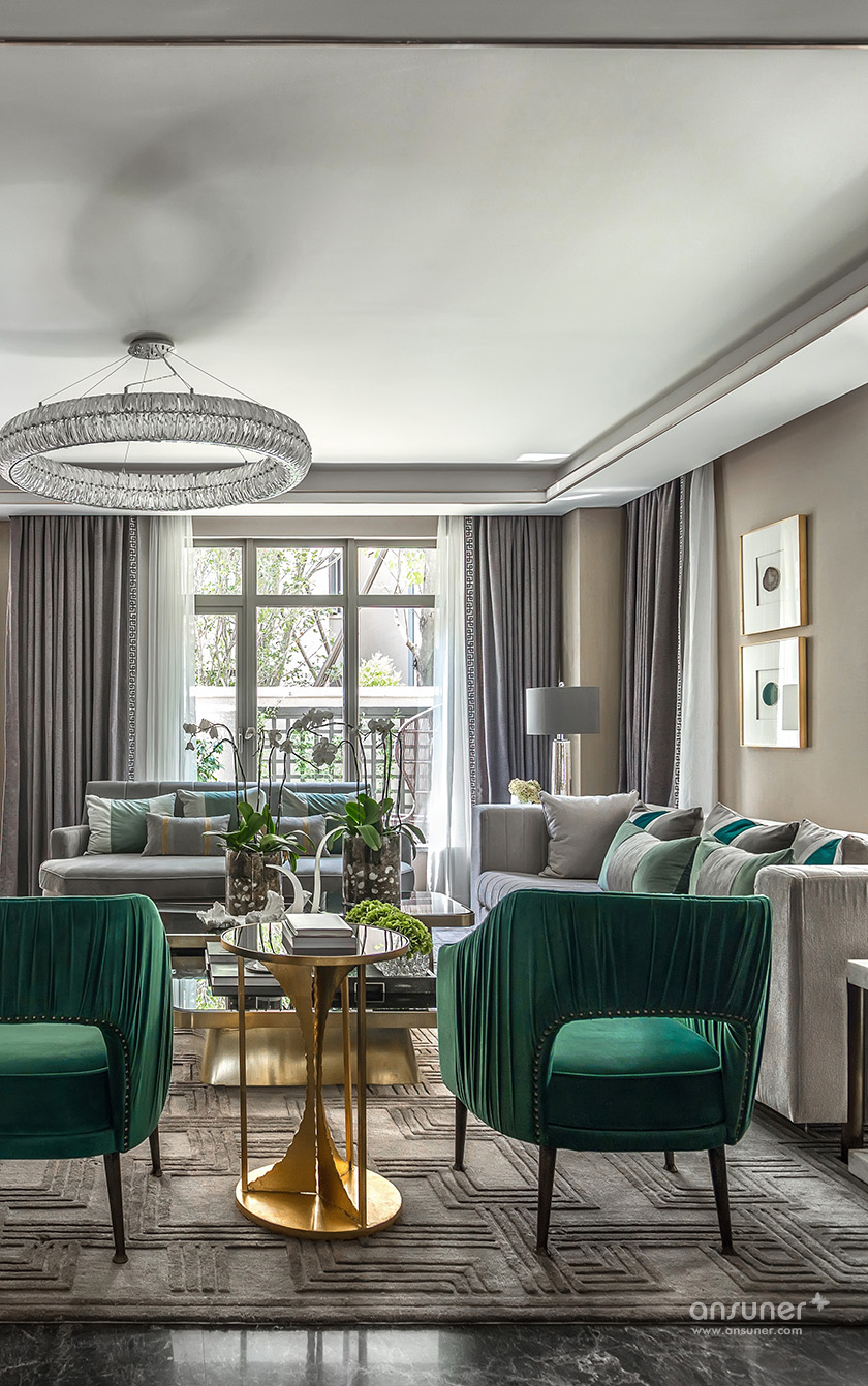 “在我看来,文化的自信与东方设计的回归,不应该仅仅停留在符号、图案、款式、线条的表面异变......甚至,在艺术与审美上,东方和西方并非泾渭分明的。”她说:设计以玉石之王翡翠的色彩,应用于灰色的主调空间,以丰富的家居配饰元素、鲜明的色彩层次及质感的材料运用,呈现了浪漫、灵动的空间之美,让这个五层的别墅呈现了绝美风华。