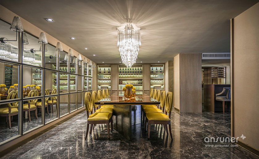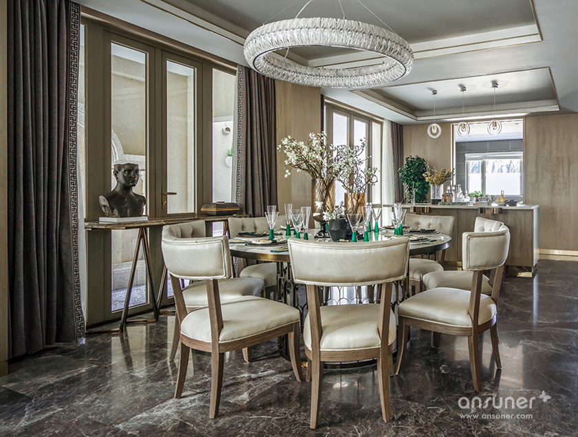 在聚餐厅,你可见独具风情的铆钉元素餐椅,来自欧洲的复古安博网页版,宛若白流苏一般的水晶吊灯,图案独特的地毯与精美的花艺,交叠出艺术的格调。