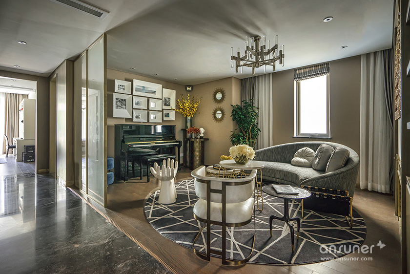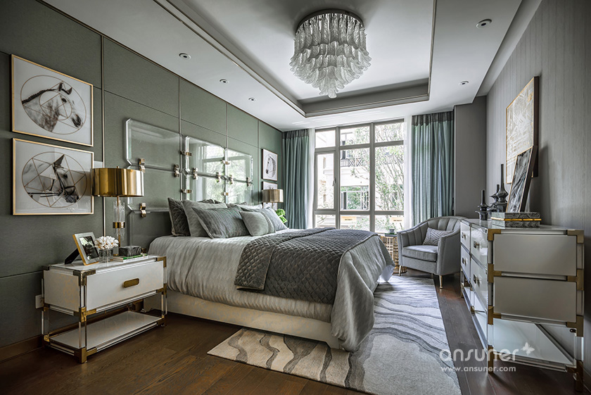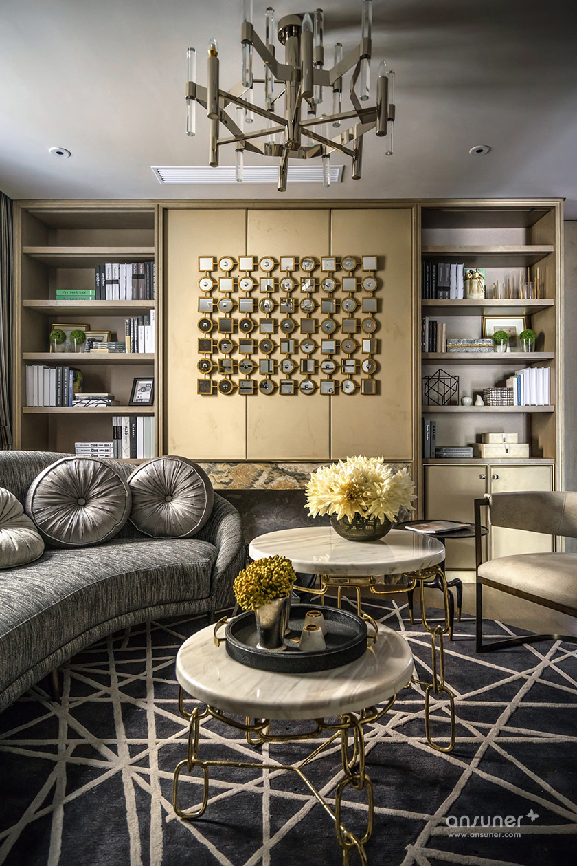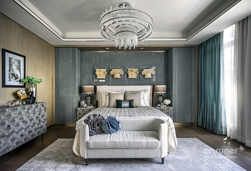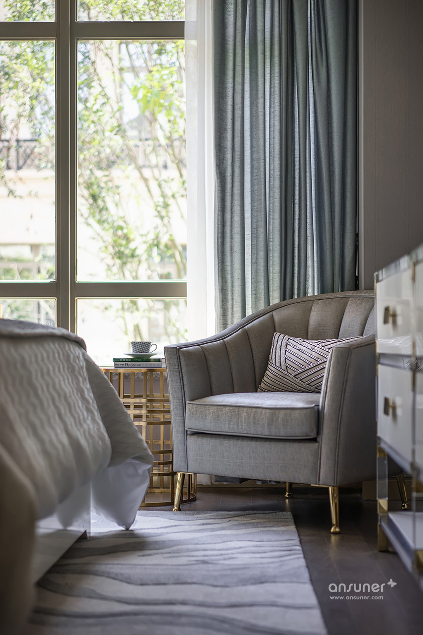 主卧休息室主调为灰色,整体空间庄重内敛,铜质饰品的介入,形成一脉形成的艺术感。
