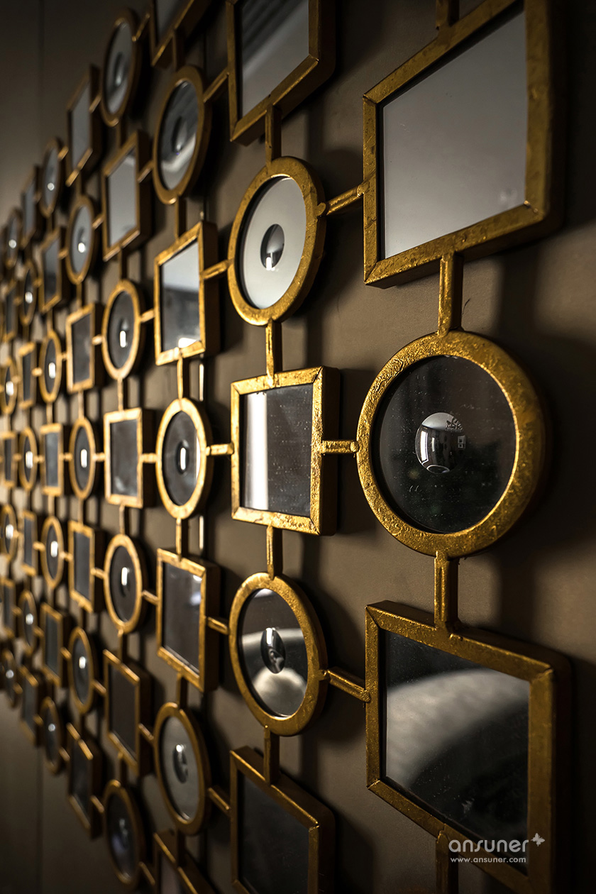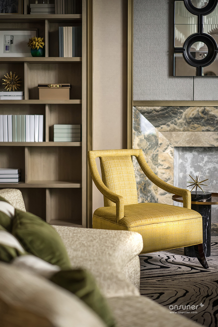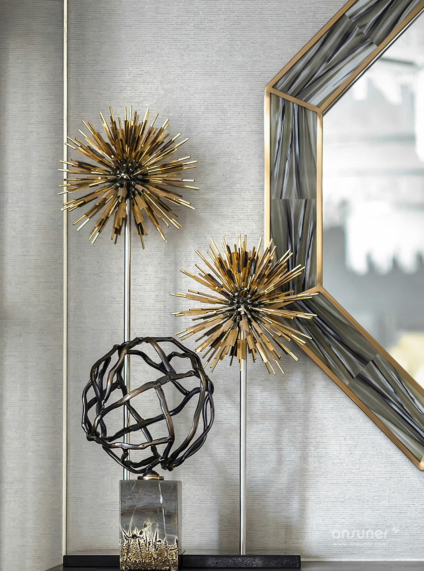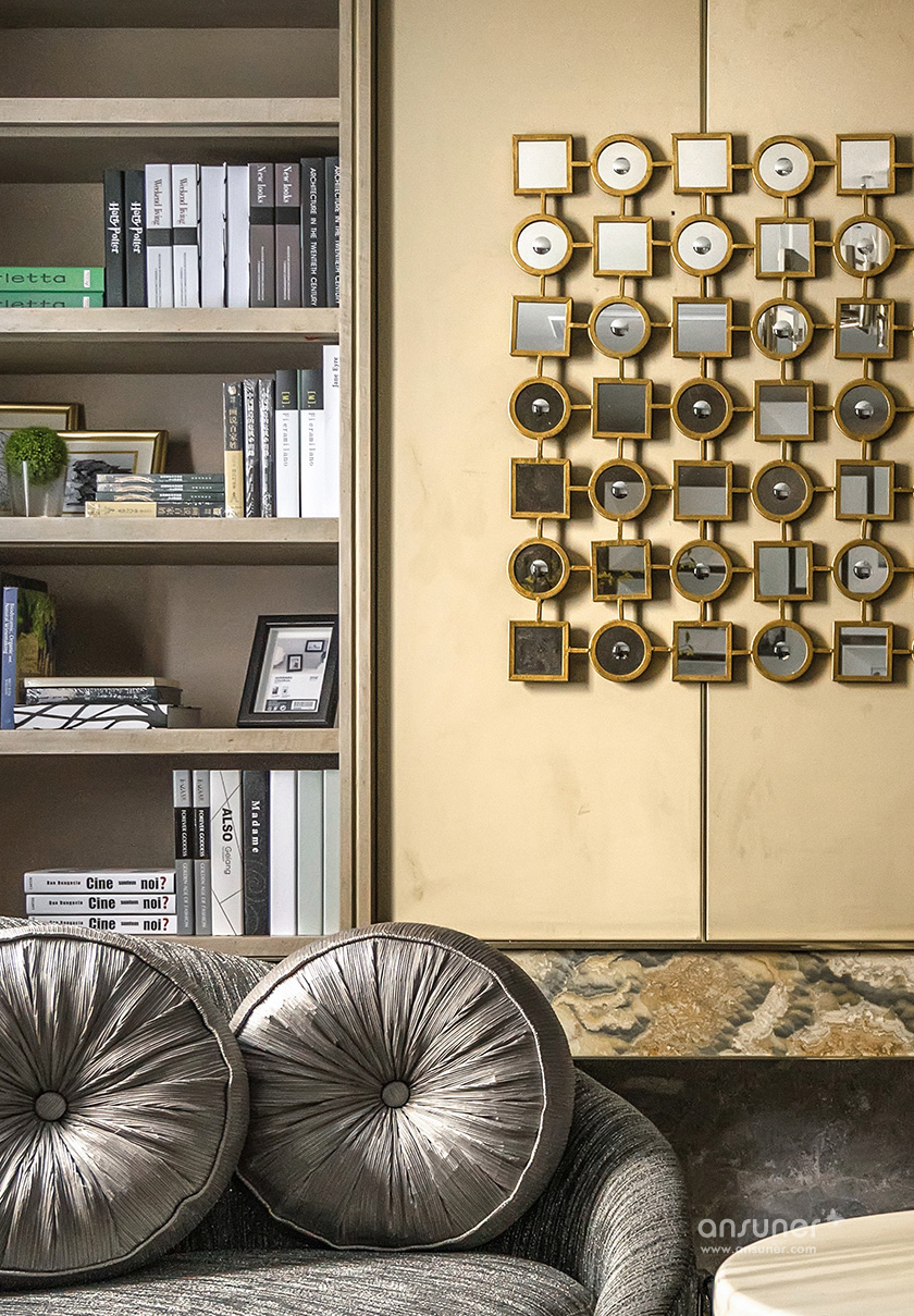 主卧休息室主调为灰色,整体空间庄重内敛,铜质饰品的介入,形成一脉形成的艺术感。